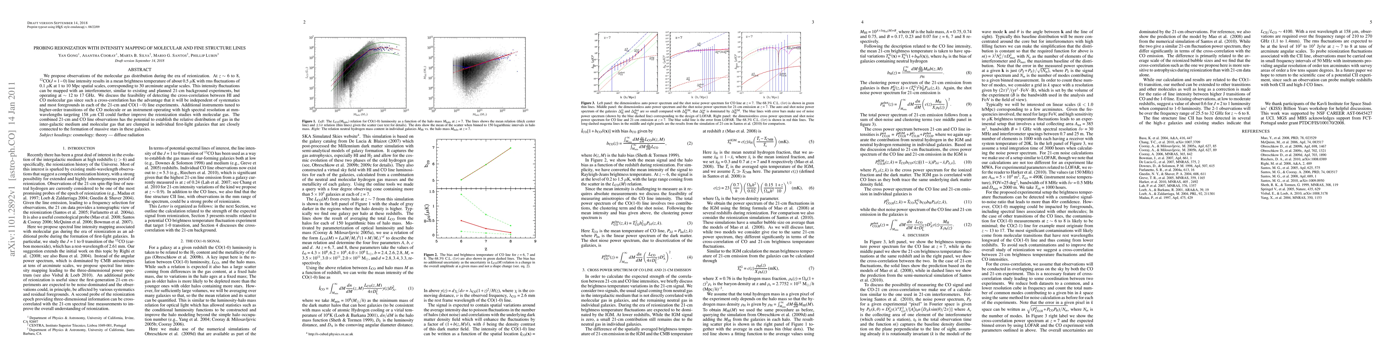 We propose observations of the molecular gas distribution during the era of reionization. At $z \sim $ 6 to 8, $^{12}$CO$(J=1-0)$ line intensity results in a mean brightness temperature of about 0.5 $\mu$K with rms fluctuations of 0.1 $\mu$K at 1 to 10 Mpc spatial scales, corresponding to 30 arcminute angular scales. This intensity fluctuations can be mapped with an interferometer, similar to existing and planned 21-cm background experiments, but operating at $\sim$ 12 to 17 GHz. We discuss the feasibility of detecting the cross-correlation between HI and CO molecular gas since such a cross-correlation has the advantage that it will be independent of systematics and most foregrounds in each of the 21-cm and CO$(1-0)$ line experiments. Additional instruments tuned to higher-order transitions of the CO molecule or an instrument operating with high spectral resolution at mm-wavelengths targeting 158 $\mu$m CII could further improve the reionization studies with molecular gas. The combined 21-cm and CO line observations has the potential to establish the relative distribution of gas in the inter-galactic medium and molecular gas that are clumped in individual first-light galaxies that are closely connected to the formation of massive stars in these galaxies.