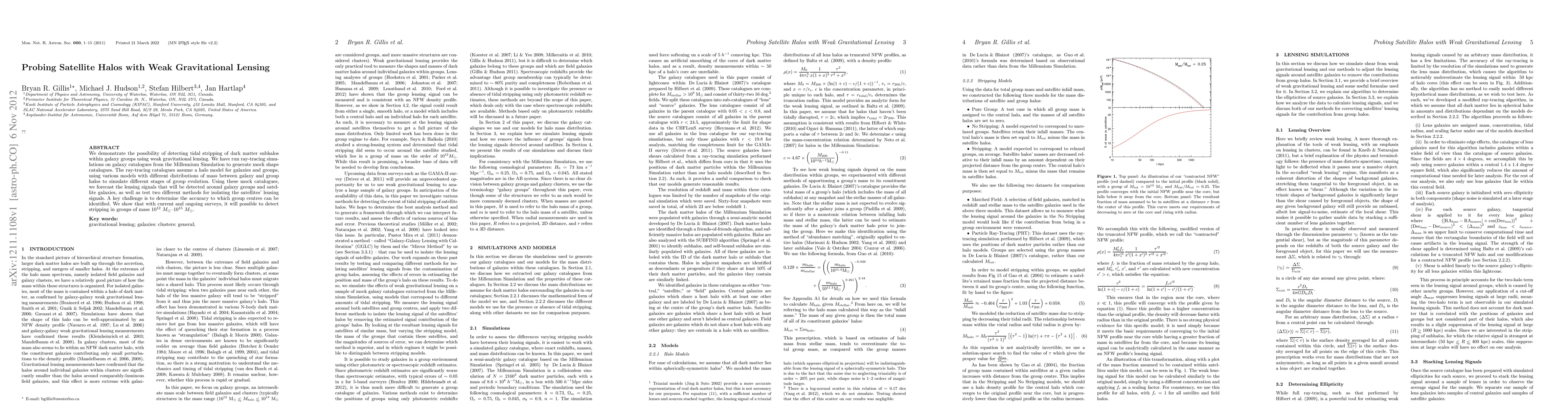 We demonstrate the possibility of detecting tidal stripping of dark matter subhalos within galaxy groups using weak gravitational lensing. We have run ray-tracing simulations on galaxy catalogues from the Millennium Simulation to generate mock shape catalogues. The ray-tracing catalogues assume a halo model for galaxies and groups, using various models with different distributions of mass between galaxy and group halos to simulate different stages of group evolution. Using these mock catalogues, we forecast the lensing signals that will be detected around galaxy groups and satellite galaxies, as well as test two different methods for isolating the satellites' lensing signals. A key challenge is to determine the accuracy to which group centres can be identified. We show that with current and ongoing surveys, it will possible to detect stripping in groups of mass 10^12--10^15 Msun.