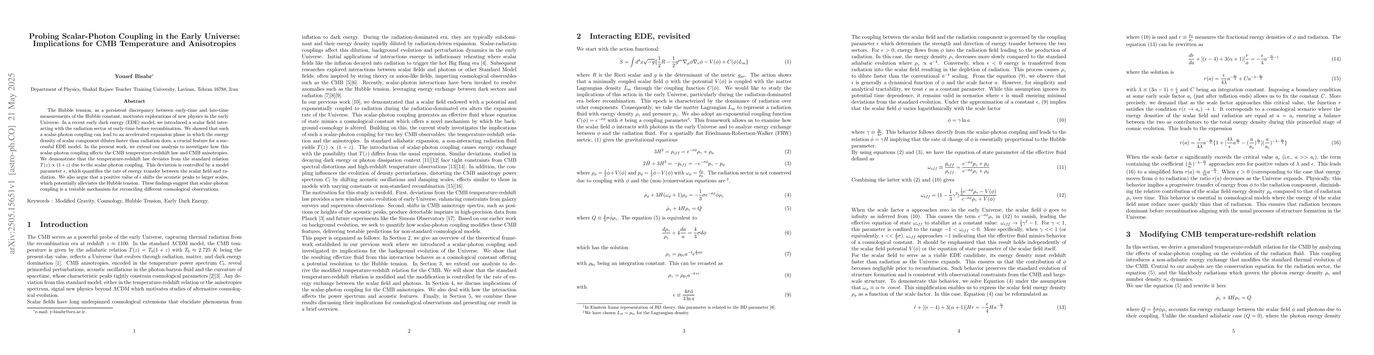 Development of a detailed analysis of scalar-photon coupling effects on CMB temperature-redshift relation and anisotropies, demonstrating its potential to resolve cosmological tensions.