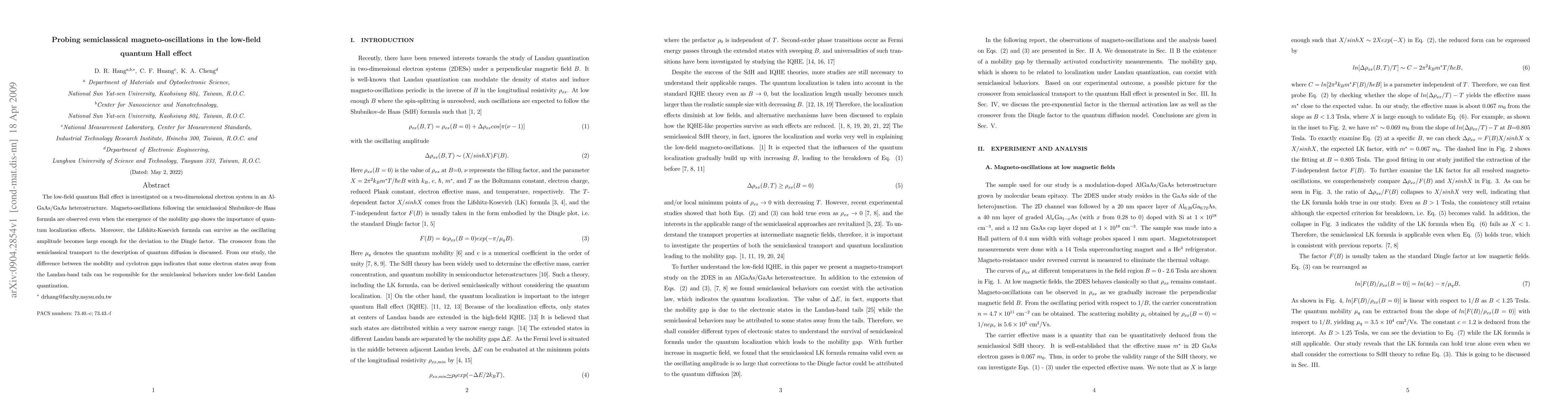 This study investigates the low-field quantum Hall effect in a two-dimensional electron system, revealing semiclassical magneto-oscillations that persist despite quantum localization effects. It shows that the Lifshitz-Kosevich formula remains valid as the amplitude increases, highlighting a crossover from semiclassical to quantum diffusion and indicating that electron states away from Landau-band tails contribute to semiclassical behavior.