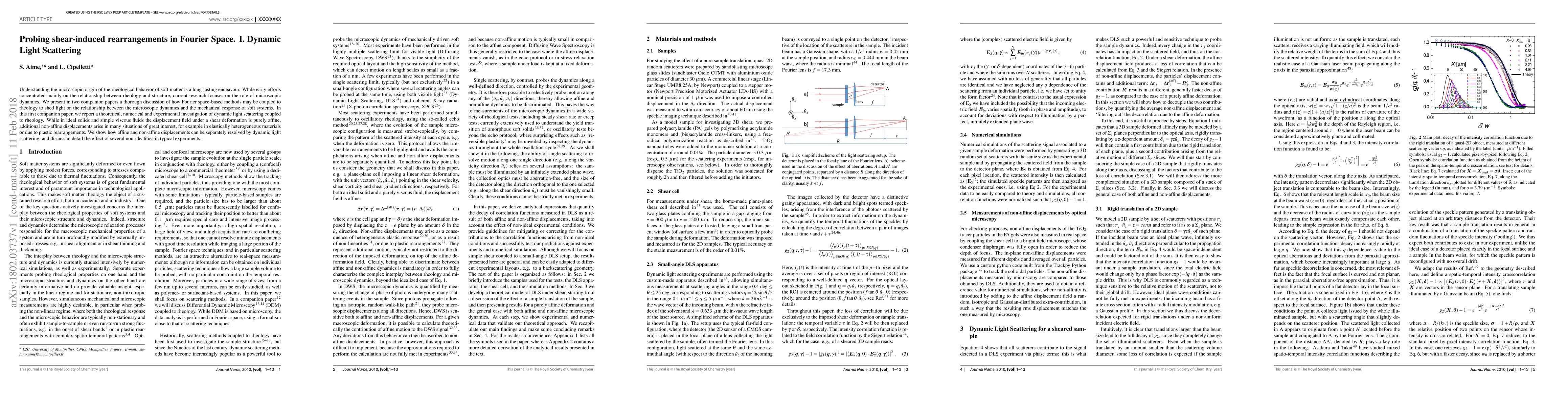Understanding the microscopic origin of the rheological behavior of soft matter is a long-lasting endeavour. While early efforts concentrated mainly on the relationship between rheology and structure, current research focuses on the role of microscopic dynamics. We present in two companion papers a thorough discussion of how Fourier space-based methods may be coupled to rheology to shed light on the relationship between the microscopic dynamics and the mechanical response of soft systems. In this first companion paper, we report a theoretical, numerical and experimental investigation of dynamic light scattering coupled to rheology. While in ideal solids and simple viscous fluids the displacement field under a shear deformation is purely affine, additional non-affine displacements arise in many situations of great interest, for example in elastically heterogeneous materials or due to plastic rearrangements. We show how affine and non-affine displacements can be separately resolved by dynamic light scattering, and discuss in detail the effect of several non-idealities in typical experiments.