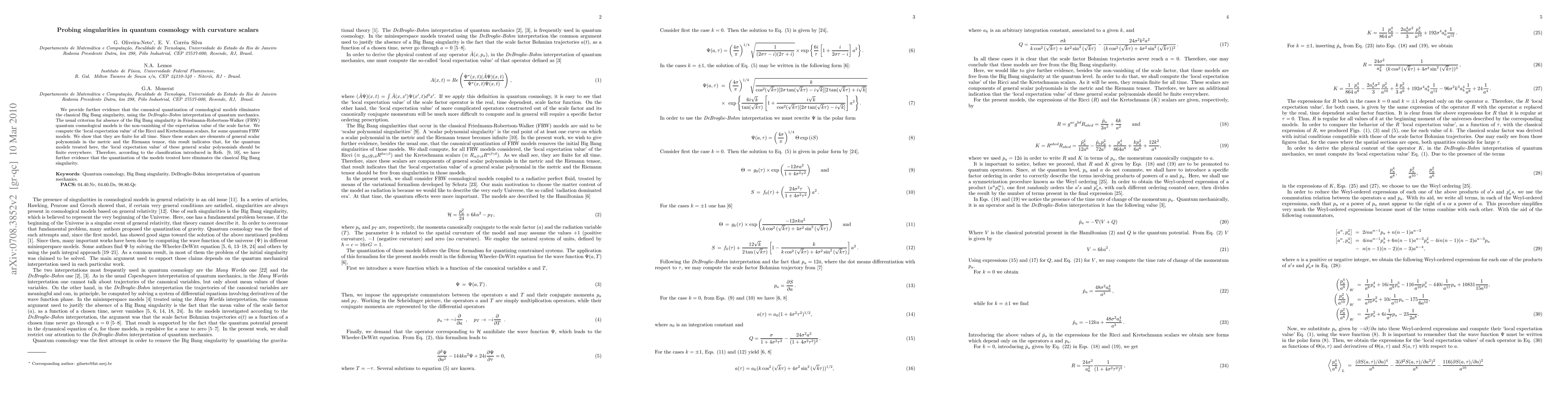We provide further evidence that the canonical quantization of cosmological models eliminates the classical Big Bang singularity, using the {\it DeBroglie-Bohm} interpretation of quantum mechanics. The usual criterion for absence of the Big Bang singularity in Friedmann-Robertson-Walker quantum cosmological models is the non-vanishing of the expectation value of the scale factor. We compute the `local expectation value' of the Ricci and Kretschmann scalars, for some quantum FRW models. We show that they are finite for all time. Since these scalars are elements of general scalar polynomials in the metric and the Riemann tensor, this result indicates that, for the quantum models treated here, the `local expectation value' of these general scalar polynomials should be finite everywhere. Therefore, we have further evidence that the quantization of the models treated here eliminates the classical Big Bang singularity. PACS: 04.40.Nr, 04.60.Ds, 98.80.Qc.