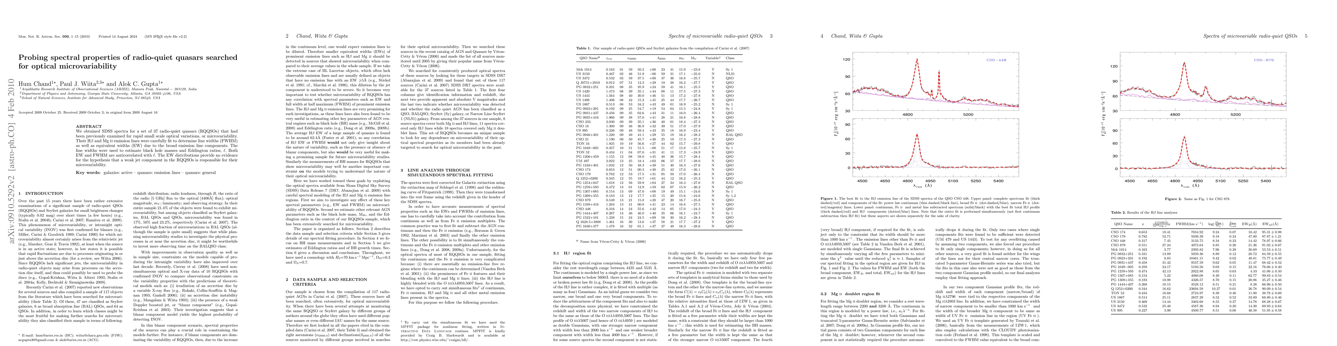 We obtained SDSS spectra for a set of 37 radio-quiet quasars (RQQSOs) that had been previously examined for rapid small scale optical variations, or microvariability. Their H-beta and Mg II emission lines were carefully fit to determine line widths (FWHM) as well as equivalent widths (EW) due to the broad emission line components. The line widths were used to estimate black hole masses and Eddington ratios, ell. Both EW and FWHM are anticorrelated with ell. The EW distributions provide no evidence for the hypothesis that a weak jet component in the RQQSOs is responsible for their microvariability.