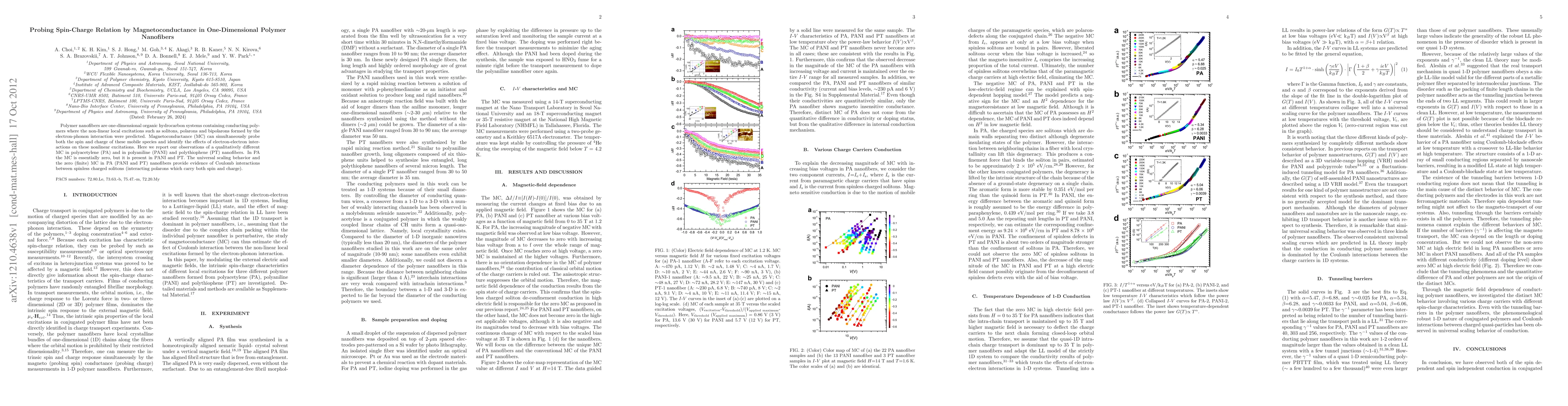 This paper investigates magnetoconductance in one-dimensional polymer nanofibers to probe the spin-charge relation. The study reveals distinct magnetoconductance behaviors in polyacetylene, polyaniline, and polythiophene nanofibers, indicating the presence of Coulomb interactions between spinless charged solitons and interacting polarons.