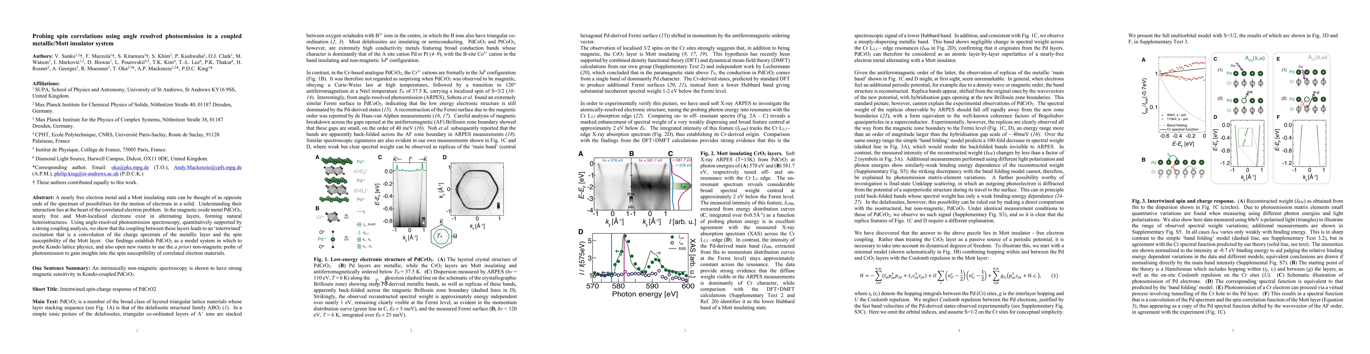 A nearly free electron metal and a Mott insulating state can be thought of as opposite ends of possibilities for the motion of electrons in a solid. In the magnetic oxide metal PdCrO$_{2}$, these two coexist as alternating layers. Using angle resolved photoemission, we surprisingly find sharp band-like features in the one-electron removal spectral function of the correlated subsystem. We show that these arise because a hole created in the Mott layer moves to and propagates in the metallic layer while retaining memory of the Mott layer's magnetism. This picture is quantitatively supported by a strong coupling analysis capturing the physics of PdCrO$_{2}$ in terms of a Kondo lattice Hamiltonian. Our findings open new routes to use the non-magnetic probe of photoemission to gain insights into the spin-susceptibility of correlated electron systems.
