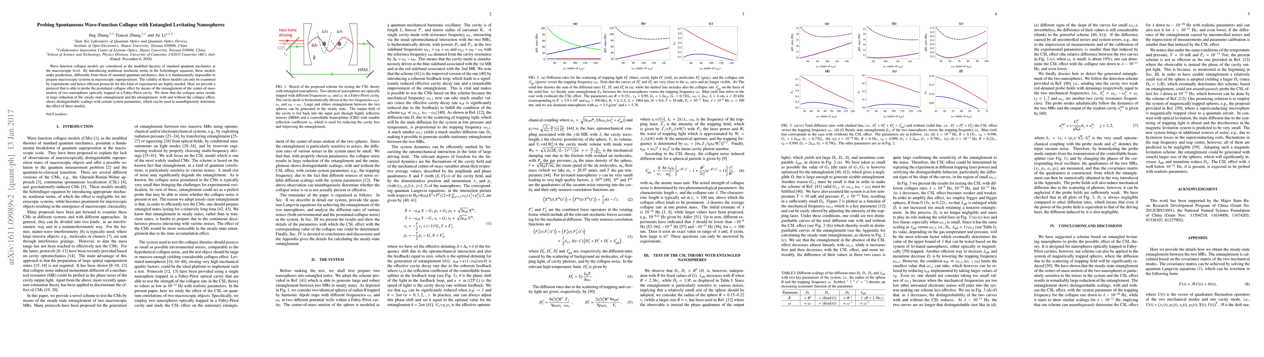 This paper proposes a protocol to test wave function collapse models using entangled levitating nanospheres in a Fabry-Pérot cavity. The experiment aims to distinguish the collapse effect by observing the reduction in entanglement due to collapse noise, providing a method to validate these modified quantum mechanics theories.