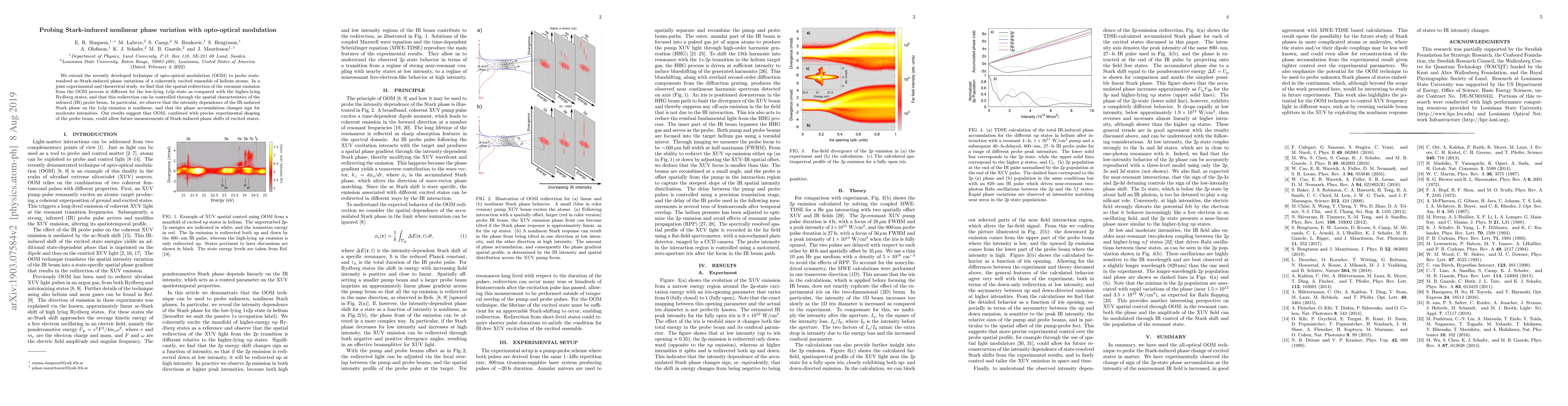 Researchers developed a technique to measure Stark-induced phase variations in helium atoms using opto-optical modulation. They found that the spatial redirection of resonant emission can be controlled through the probe beam's spatial characteristics.