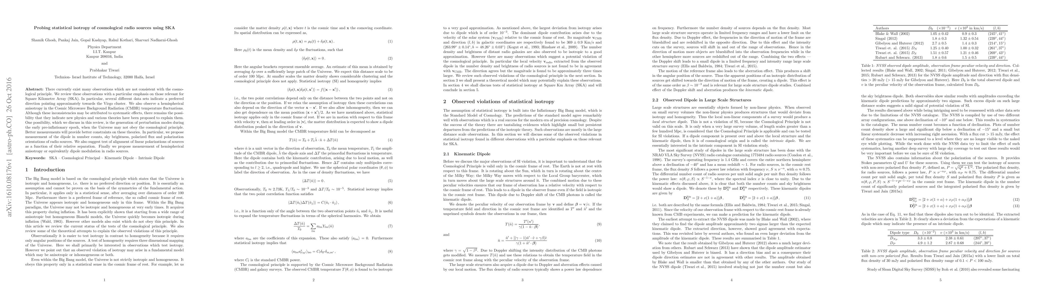 There currently exist many observations which are not consistent with the cosmological principle. We review these observations with a particular emphasis on those relevant for Square Kilometre Array (SKA). In particular, several different data sets indicate a preferred direction pointing approximately towards the Virgo cluster. We also observe a hemispherical anisotropy in the Cosmic Microwave Background Radiation (CMBR) temperature fluctuations. Although these inconsistencies may be attributed to systematic effects, there remains the possibility that they indicate new physics and various theories have been proposed to explain them. One possibility, which we discuss in this review, is the generation of perturbation modes during the early pre-inflationary epoch, when the Universe may not obey the cosmological principle. Better measurements will provide better constraints on these theories. In particular, we propose measurement of the dipole in number counts, sky brightness, polarized flux and polarization orientations of radio sources. We also suggest test of alignment of linear polarizations of sources as a function of their relative separation. Finally we propose measurement of hemispherical anisotropy or equivalently dipole modulation in radio sources.