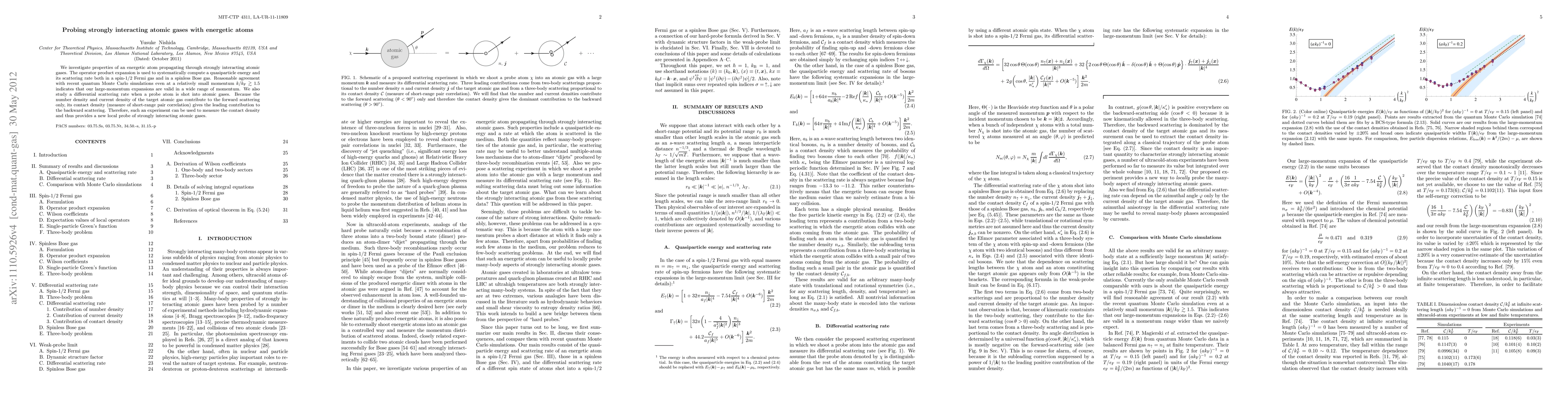 This paper investigates the quasiparticle energy and scattering rate of energetic atoms moving through strongly interacting atomic gases, using operator product expansion and comparing results with quantum Monte Carlo simulations. The study reveals that the contact density of the atomic gas primarily influences backward scattering, offering a new method to measure this density.