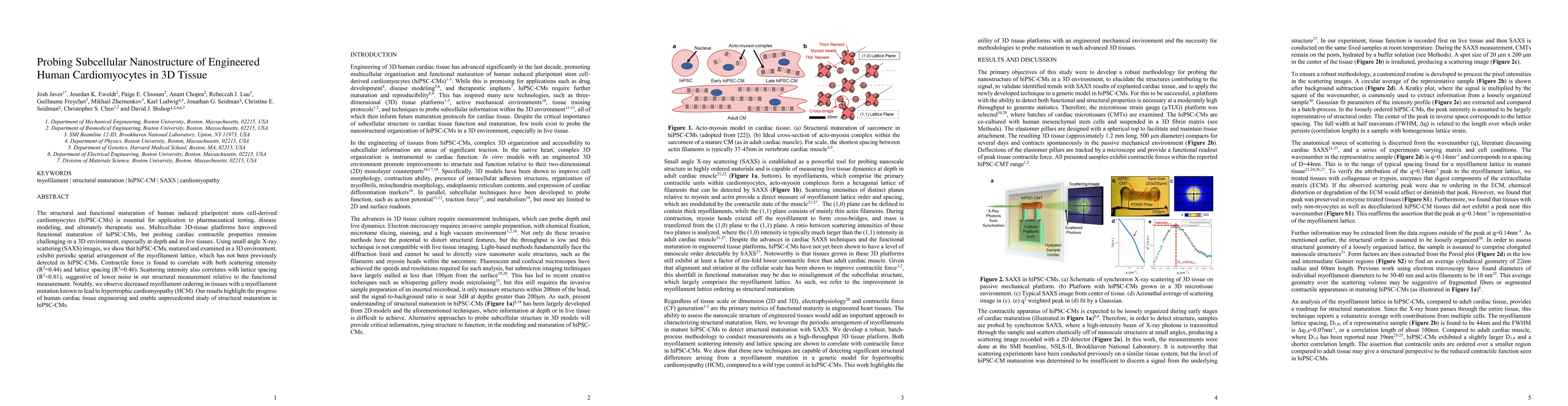 This study uses small angle X-ray scattering to reveal the periodic spatial arrangement of myofilament lattice in 3D tissue-engineered human iPSC-CMs, correlating contractile force with scattering intensity and lattice spacing. It also identifies decreased myofilament ordering in HCM-linked mutations, underscoring the potential of 3D tissue platforms for cardiac tissue engineering.