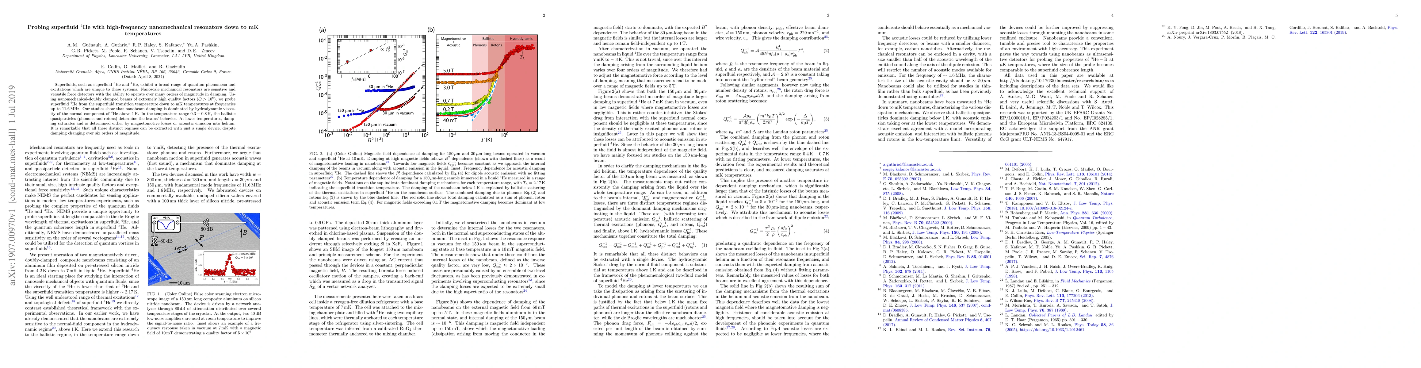 This paper investigates superfluid $^4\mathrm{He}$ using nanomechanical resonators, revealing distinct damping regimes from the superfluid transition to $\mathrm{mK}$ temperatures. The study finds that damping is dominated by the normal component's viscosity above $1\,\mathrm{K}$, while phonons and rotons govern behavior at intermediate temperatures, and magnetomotive losses or acoustic emission dominate at lower temperatures.