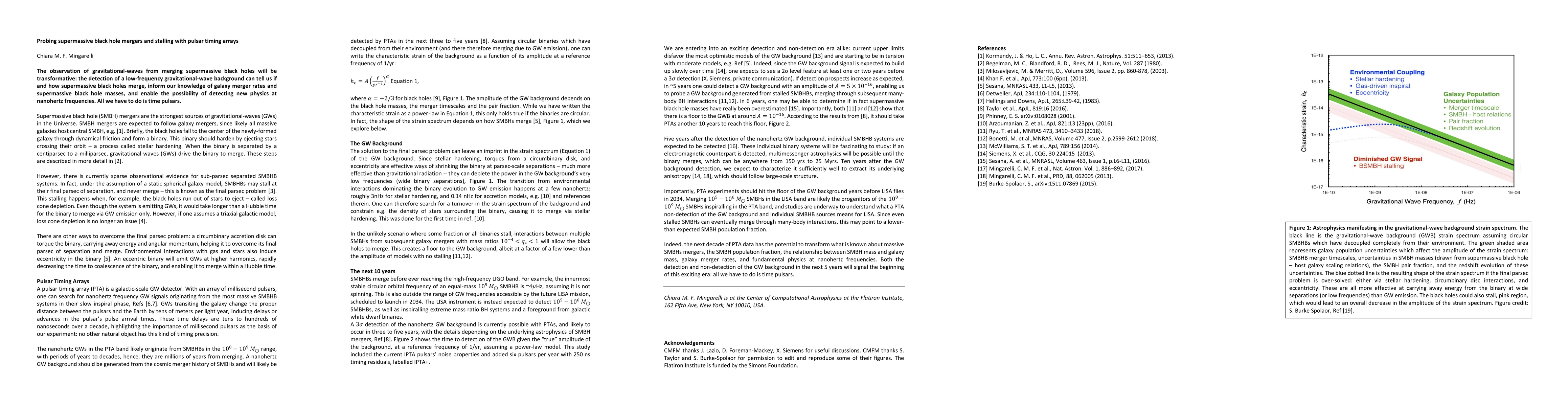 The observation of gravitational-waves from merging supermassive black holes will be transformative: the detection of a low-frequency gravitational-wave background can tell us if and how supermassive black holes merge, inform our knowledge of galaxy merger rates and supermassive black hole masses, and enable the possibility of detecting new physics at nanohertz frequencies. All we have to do is time pulsars.