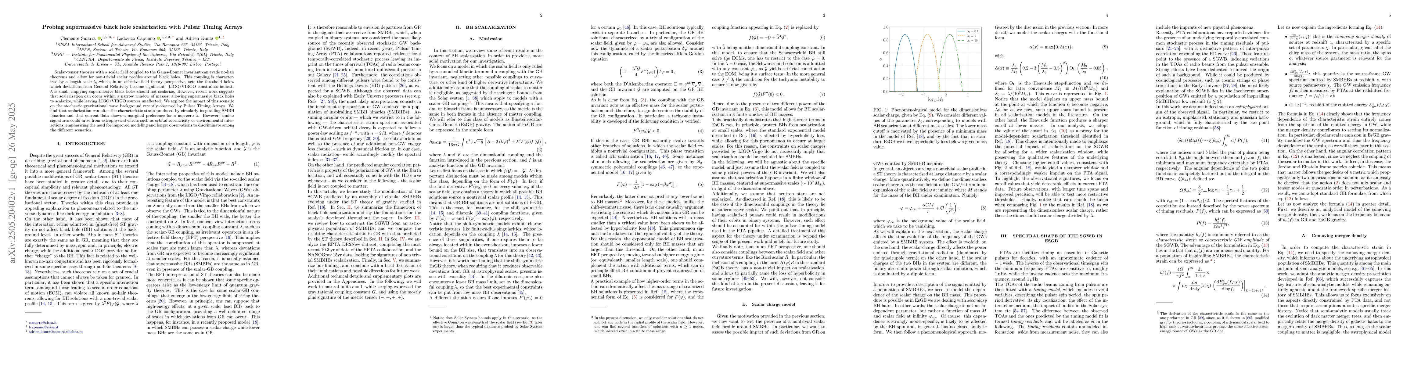 This work builds upon existing LIGO/VIRGO constraints by exploring the possibility of scalarization within a specific mass window for supermassive black holes, unexplored by previous gravitational wave detections, and its implications for PTAs.