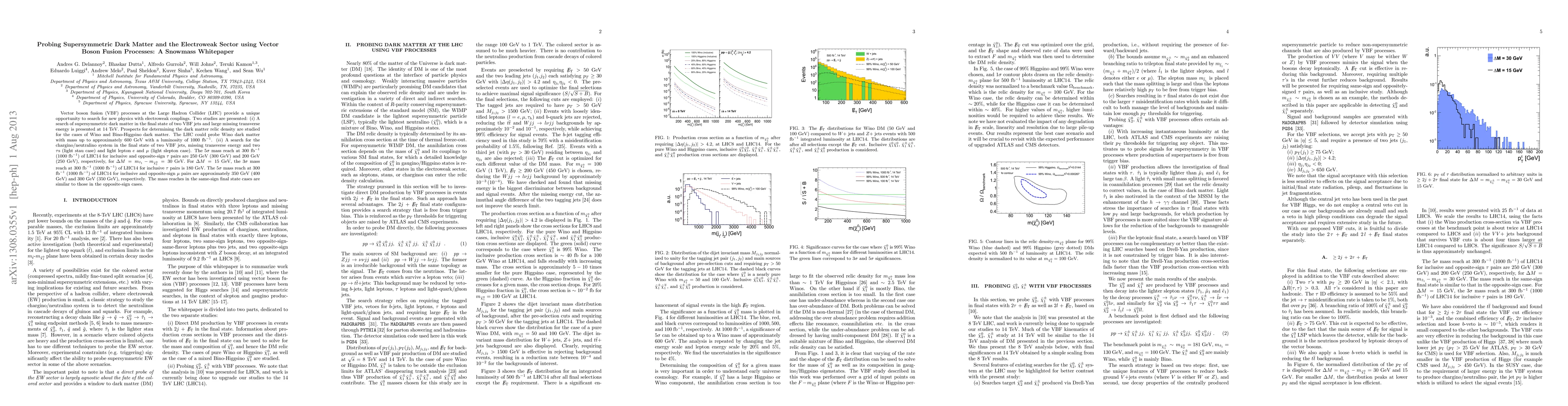 Vector boson fusion (VBF) processes at the Large Hadron Collider (LHC) provide a unique opportunity to search for new physics with electroweak couplings. Two studies are presented: (i) A search of supersymmetric dark matter in the final state of two VBF jets and large missing transverse energy is presented at 14 TeV. Prospects for determining the dark matter relic density are studied for the cases of Wino and Bino-Higgsino dark matter. The LHC could probe Wino dark matter with mass up to approximately 600 GeV with a luminosity of 1000 fb$^{-1}$. (ii) A search for the chargino/neutralino system in the final state of two VBF jets, missing transverse energy and two $\tau$'s (light stau case) and light lepton $e$ and $\mu$ (light slepton case). The $5 \sigma$ mass reach at 300 fb$^{-1}$ (1000 fb$^{-1}$) of LHC14 for inclusive and opposite-sign $\tau$ pairs are 250 GeV (300 GeV) and 200 GeV (250 GeV), respectively, for $\Delta M \, = \, m_{\tilde{\tau}_1} - m_{\neu{1}} \, = \, 30$ GeV. For $\Delta M \, = \, 15$ GeV, the $3 \sigma$ mass reach at 300 fb$^{-1}$ (1000 fb$^{-1}$) of LHC14 for inclusive $\tau$ pairs is 180 GeV. The $5 \sigma$ mass reach at 300 fb$^{-1}$ (1000 fb$^{-1}$) of LHC14 for inclusive and opposite-sign $\mu$ pairs are approximately 350 GeV (400 GeV) and 300 GeV (350 GeV), respectively. The mass reaches in the same-sign final state cases are similar to those in the opposite-sign cases.