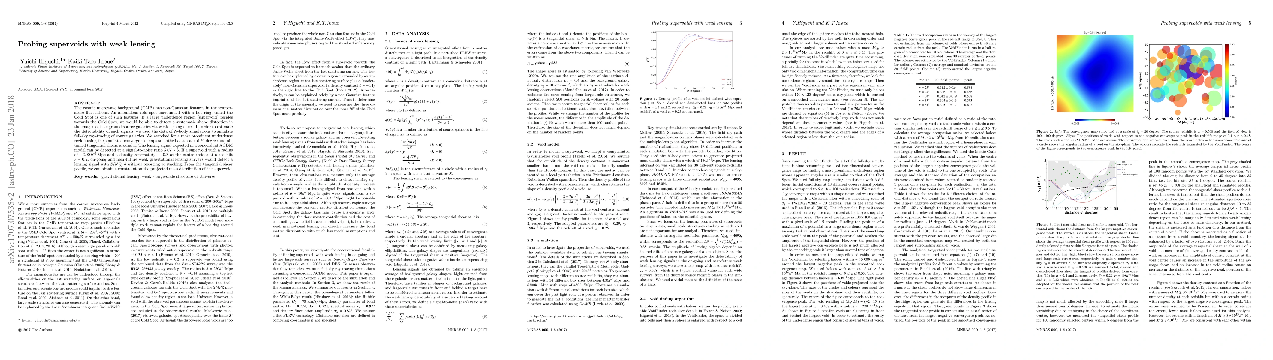 The cosmic microwave background (CMB) has non-Gaussian features in the temperature fluctuations. An anomalous cold spot surrounded with a hot ring, called the Cold Spot is one of such features. If a large underdence region (supervoid) resides towards the Cold Spot, we would be able to detect a systematic shape distortion in the images of background source galaxies via weak lensing effect. In order to estimate the detectability of such signals, we used the data of $N$-body simulations to simulate full-sky ray-tracing of source galaxies. We searched for a most prominent underdense region using the simulated convergence maps smoothed at a scale of 20 degree and obtained tangential shears around it. The lensing signal expected in a concordant $\Lambda$CDM model can be detected at a signal-to-noise ratio $S/N\sim3$. If a supervoid with a radius of $\sim 200\,h^{-1}\,\textrm{Mpc}$ and a density contrast $\delta_0 \sim -0.3$ at the centre resides at a redshift $z\sim 0.2$, on-going and near-future weak gravitational lensing surveys would detect a lensing signal with $S/N\gtrsim4$ without resorting to stacking. From the tangential shear profile, we can obtain a constraint on the projected mass distribution of the supervoid.