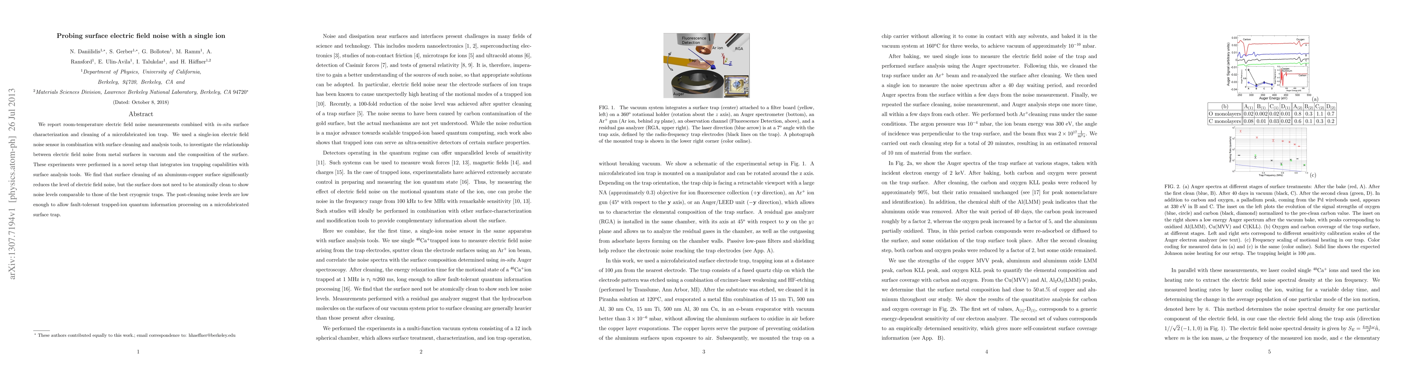 We report room-temperature electric field noise measurements combined with in-situ surface characterization and cleaning of a microfabricated ion trap. We used a single-ion electric field noise sensor in combination with surface cleaning and analysis tools, to investigate the relationship between electric field noise from metal surfaces in vacuum and the composition of the surface. These experiments were performed in a novel setup that integrates ion trapping capabilities with surface analysis tools. We find that surface cleaning of an aluminum-copper surface significantly reduces the level of electric field noise, but the surface does not need to be atomically clean to show noise levels comparable to those of the best cryogenic traps. The post-cleaning noise levels are low enough to allow fault-tolerant trapped-ion quantum information processing on a microfabricated surface trap.