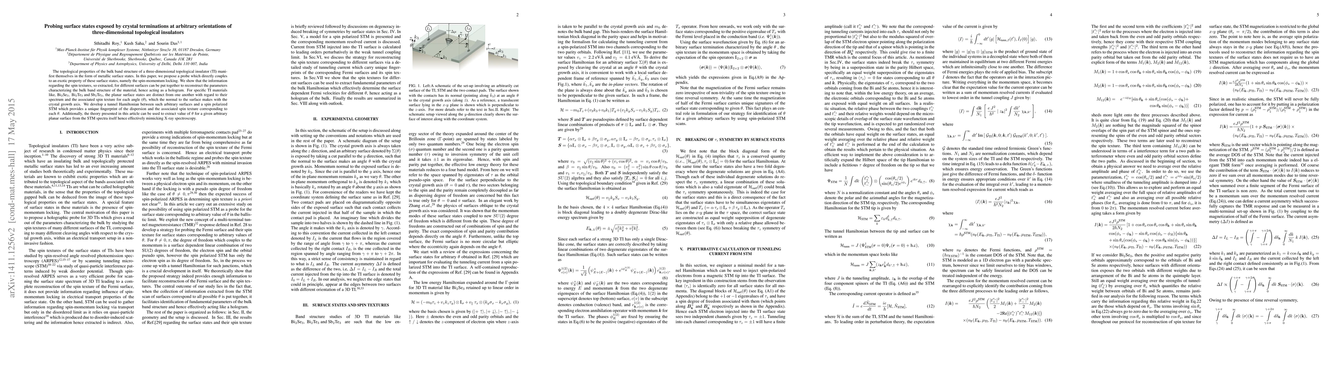 The topological properties of the bulk band structure of a three-dimensional topological insulator (TI) manifest themselves in the form of metallic surface states. In this paper, we propose a probe which directly couples to an exotic property of these surface states, namely the spin-momentum locking. We show that the information regarding the spin textures, so extracted, for different surfaces can be put together to reconstruct the parameters characterizing the bulk band structure of the material, hence acting as a hologram. For specific TI materials like, $\text{Bi}_2\text{Se}_3, \text{Bi}_2\text{Te}_3 \text{and Sb}_2\text{Te}_3$, the planar surface states are distinct from one another with regard to their spectrum and the associated spin texture for each angle ($\theta$), which the normal to the surface makes with the crystal growth axis. We develop a tunnel Hamiltonian between such arbitrary surfaces and a spin polarized STM which provides a unique fingerprint of the dispersion and the associated spin texture corresponding to each $\theta$. Additionally, the theory presented in this article can be used to extract value of $\theta$ for a given arbitrary planar surface from the STM spectra itself hence effectively mimicking X-ray spectroscopy.