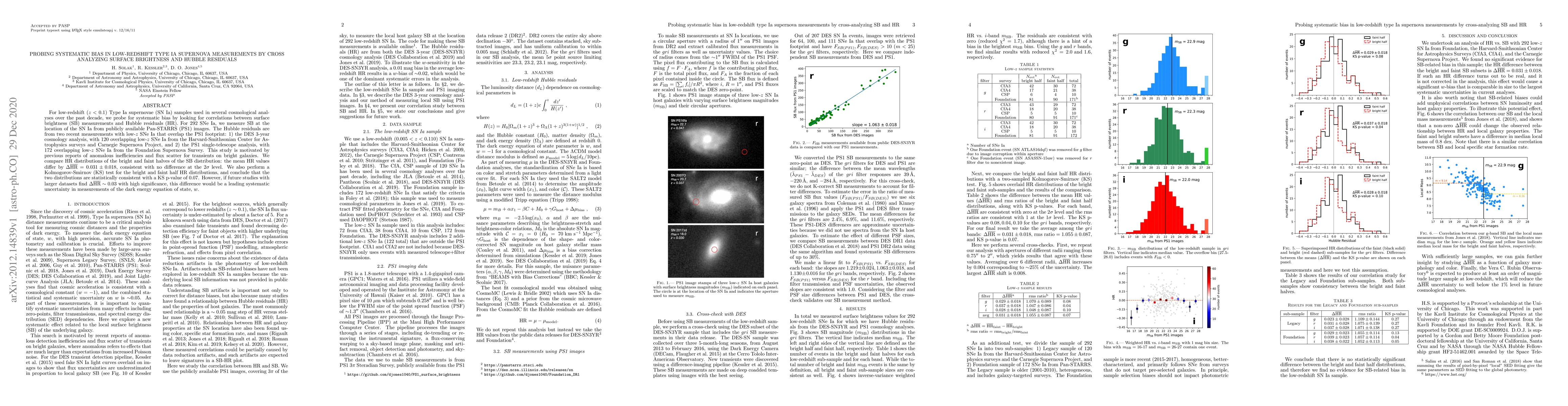 For low-redshift (z < 0.1) Type Ia supernovae (SN Ia) samples used in several cosmological analyses over the past decade, we probe for systematic bias by looking for correlations between surface brightness (SB) measurements and Hubble residuals (HR). For 292 SNe Ia, we measure SB at the location of the SN Ia from publicly available Pan-STARRS (PS1) images. The Hubble residuals are from two recent measurements with low-z SNe Ia that overlap the PS1 footprint: 1) the DES 3-year cosmology analysis, with 120 overlapping low-z SNe Ia from the Harvard-Smithsonian Center for Astrophysics surveys and Carnegie Supernova Project, and 2) the PS1 single-telescope analysis, with 172 overlapping low-z SNe Ia from the Foundation Supernova Survey. This study is motivated by previous reports of anomalous inefficiencies and flux scatter for transients on bright galaxies. We compare HR distributions of the bright and faint halves of the SB distribution: the mean HR values differ by Delta HR = 0.031 +- 0.018, consistent with no difference at the 2 sigma level. We also perform a Kolmogorov-Smirnov (KS) test for the bright and faint half HR distributions, and conclude that the two distributions are statistically consistent with a KS p-value of 0.07. However, if future studies with larger datasets find Delta HR ~ 0.03 with high significance, this difference would be a leading systematic uncertainty in measurements of the dark energy equation of state, w.