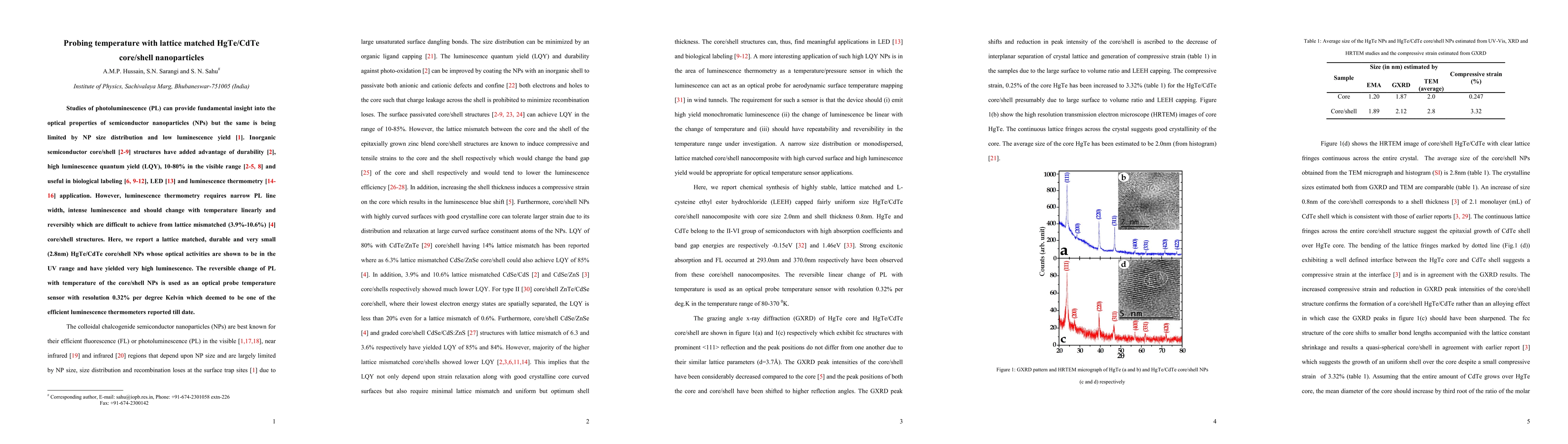Studies of photoluminescence (PL) can provide fundamental insight into the optical properties of semiconductor nanoparticles (NPs) but the same is being limited by NP size distribution and low luminescence yield. Inorganic semiconductor core/shell structures have added advantage of durability, high luminescence quantum yield (LQY), 10-80% in the visible range and useful in biological labeling, LED and luminescence thermometry application. However, luminescence thermometry requires narrow PL line width, intense luminescence and should change with temperature linearly and reversibly which are difficult to achieve from lattice mismatched (3.9%-10.6%) core/shell structures. Here, we report a lattice matched, durable and very small (2.8nm) HgTe/CdTe core/shell NPs whose optical activities are shown to be in the UV range and have yielded very high luminescence. The reversible change of PL with temperature of the core/shell NPs is used as an optical probe temperature sensor with resolution 0.32% per degree Kelvin which deemed to be one of the efficient luminescence thermometers reported till date.
