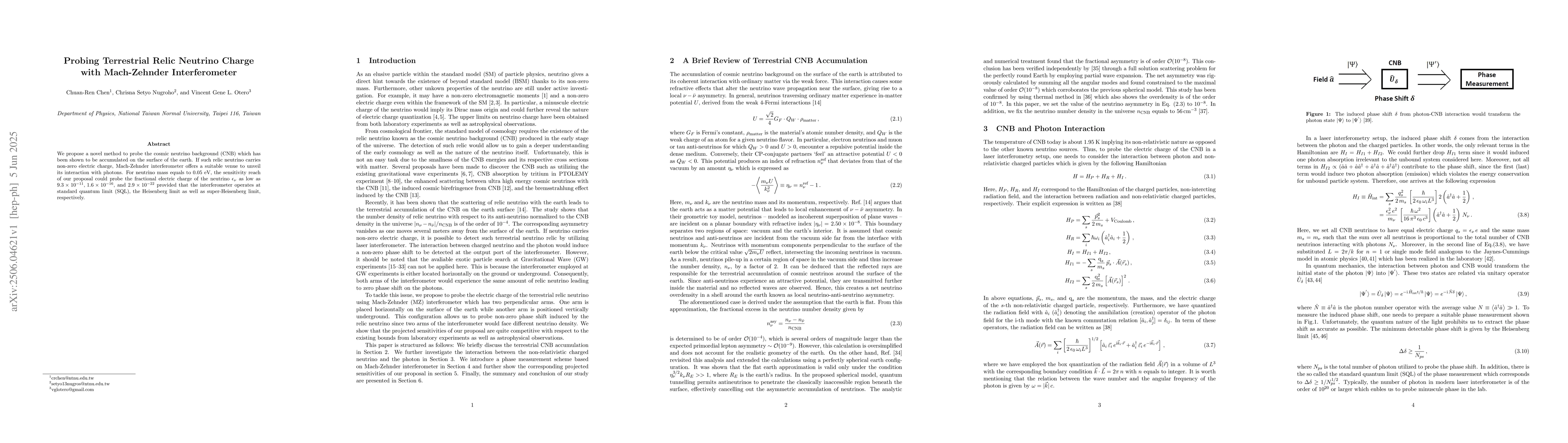 This research proposes using a Mach-Zehnder interferometer to detect the electric charge of cosmic relic neutrinos accumulated on Earth's surface. With neutrino mass at 0.05 eV, the method can reach sensitivities of $9.3 \times 10^{-11}$, $1.6 \times 10^{-16}$, and $2.9 \times 10^{-22}$ for standard quantum limit, Heisenberg limit, and super-Heisenberg limit, respectively.