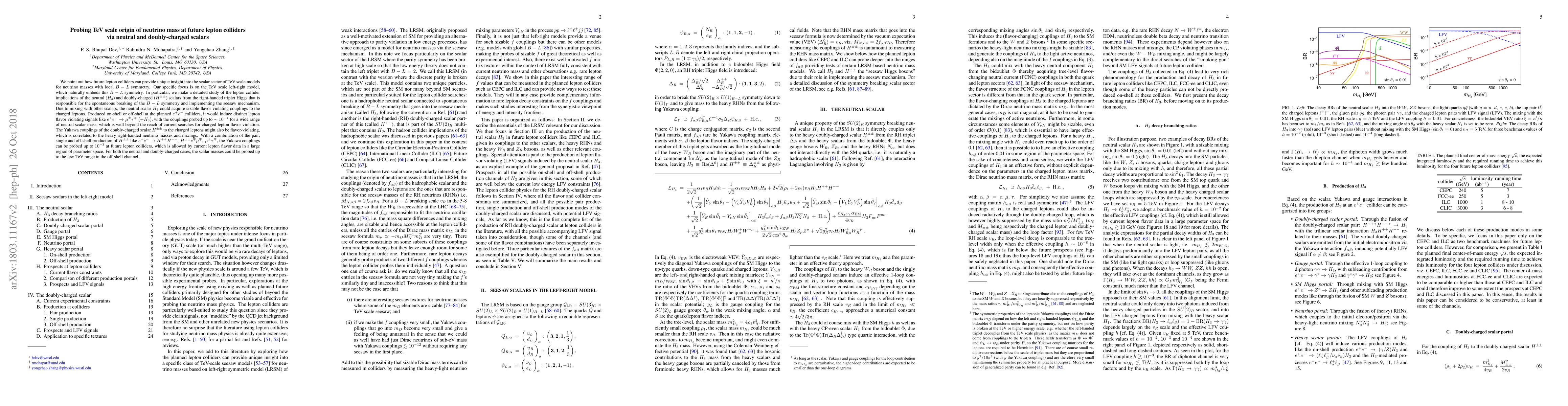 This paper explores the potential of future lepton colliders to investigate the TeV scale origin of neutrino mass through neutral and doubly-charged scalars in the left-right model with local $B-L$ symmetry. It highlights the distinct lepton flavor violating signals and Yukawa couplings that can be probed, extending beyond current experimental limits.