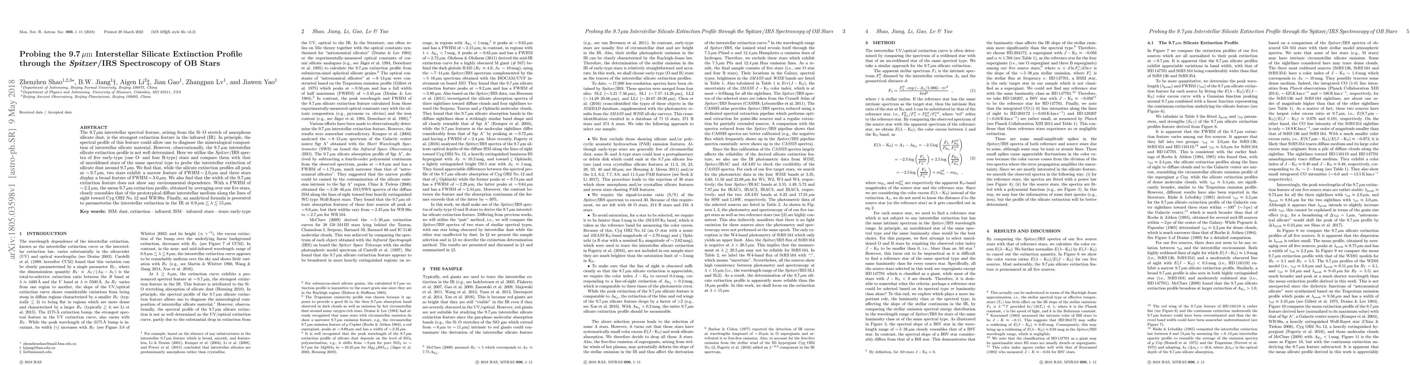 Researchers used Spitzer/IRS spectroscopy to study the 9.7µm interstellar silicate extinction profile around early-type stars, finding that two stars have a narrow feature and three have a broad one, with a mean width of 2.2µm.