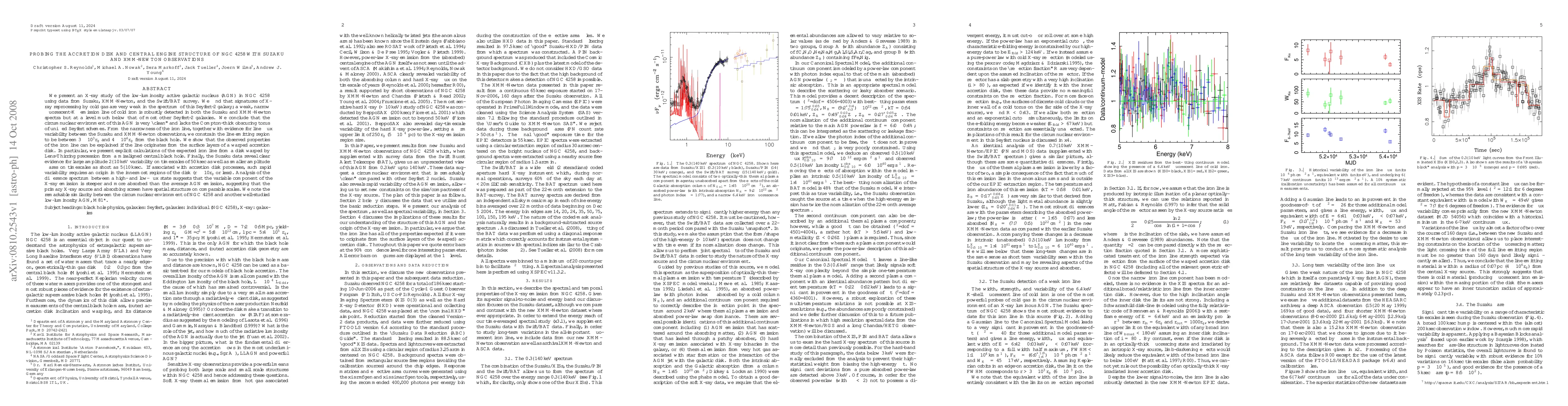 This study of NGC4258's AGN using Suzaku and XMM-Newton data reveals a 'clean' circumnuclear environment lacking a Compton-thick obscuring torus. The narrow, variable iron line emission suggests an origin from the surface layers of a warped accretion disk. Rapid X-ray variability implies an origin in the innermost disk regions.