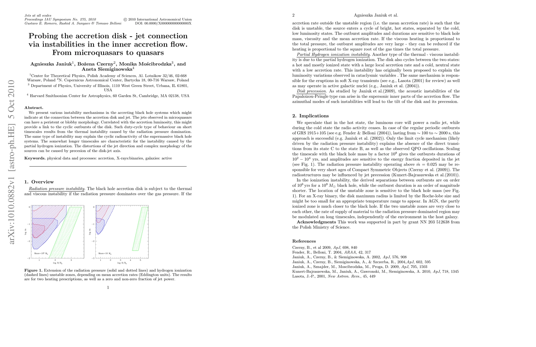 This paper explores instability mechanisms in accreting black hole systems that link accretion disks and jets, using microquasars and quasars as examples. The study identifies thermal instabilities and partial hydrogen ionization as factors causing cyclic outbursts and complex jet morphologies, respectively.