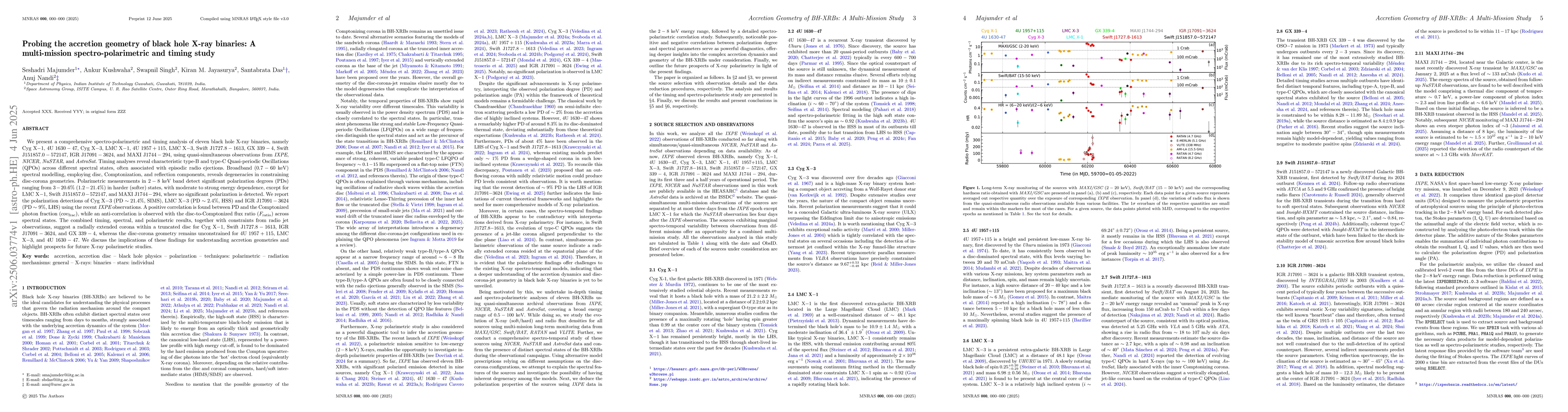 This study analyzes 11 black hole X-ray binaries using multiple space missions to investigate their accretion geometry, revealing characteristic Quasi-Periodic Oscillations and polarization degrees that suggest a radially extended corona within a truncated disc for some systems.