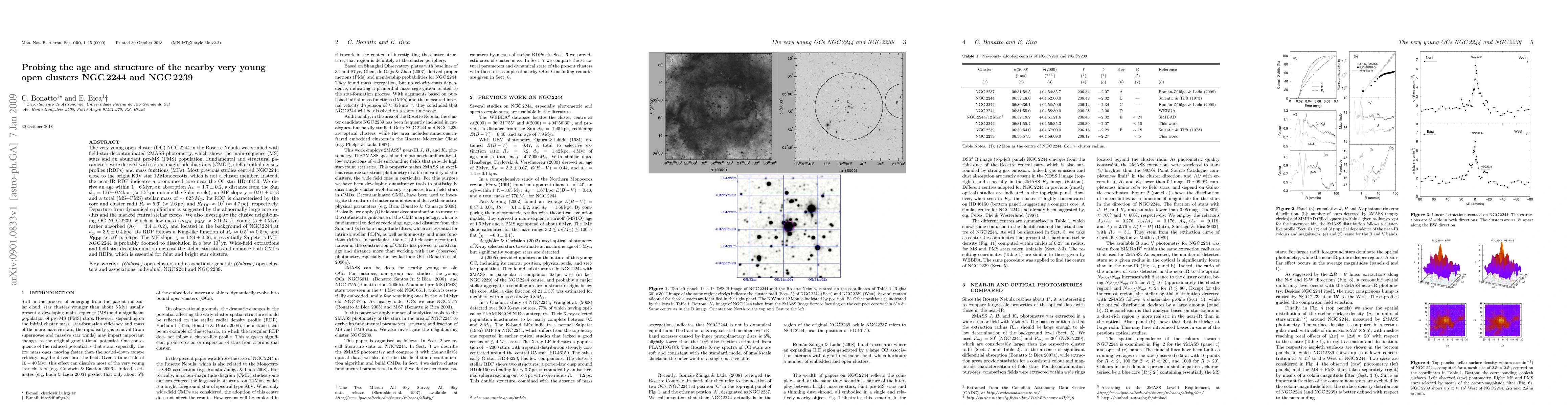 The very young open cluster (OC) NGC 2244 in the Rosette Nebula was studied with field-star-decontaminated 2MASS photometry, which shows the main-sequence (MS) stars and an abundant pre-MS (PMS) population. Fundamental and structural parameters were derived with colour-magnitude diagrams (CMDs), stellar radial density profiles (RDPs) and mass functions (MFs). Most previous studies centred NGC 2244 close to the bright K0V star 12 Monocerotis, which is not a cluster member. Instead, the near-IR RDP indicates a pronounced core near the O5 star HD 46150. We derive an age within 1--6 Myr, an absorption $\aV=1.7\pm0.2$, a distance from the Sun $\ds=1.6\pm0.2$ kpc ($\approx1.5$ kpc outside the Solar circle), an MF slope $\chi=0.91\pm0.13$ and a total (MS+PMS) stellar mass of $\sim625 \ms$. Its RDP is characterised by the core and cluster radii $\rc\approx5.6\arcmin$ ($\approx2.6$ pc) and $\rl\approx10\arcmin$ ($\approx4.7$ pc), respectively. Departure from dynamical equilibrium is suggested by the abnormally large core radius and the marked central stellar excess. We also investigate the elusive neighbouring OC NGC 2239, which is low-mass ($m_{MS+PMS}\approx301 \ms$), young ($5\pm4$ Myr) rather absorbed ($\aV=3.4\pm0.2$), and located in the background of NGC 2244 at $\ds=3.9\pm0.4$ kpc. Its RDP follows a King-like function of $\rc\approx0.5\arcmin\approx0.5$ pc and $\rl\approx5.0\arcmin\approx5.6$ pc. The MF slope, $\chi=1.24\pm0.06$, is essentially Salpeter's IMF. NGC 2244 is probably doomed to dissolution in a few $10^7$ yr. Wide-field extractions and field-star decontamination increase the stellar statistics and enhance both CMDs and RDPs, which is essential for faint and bright star clusters.