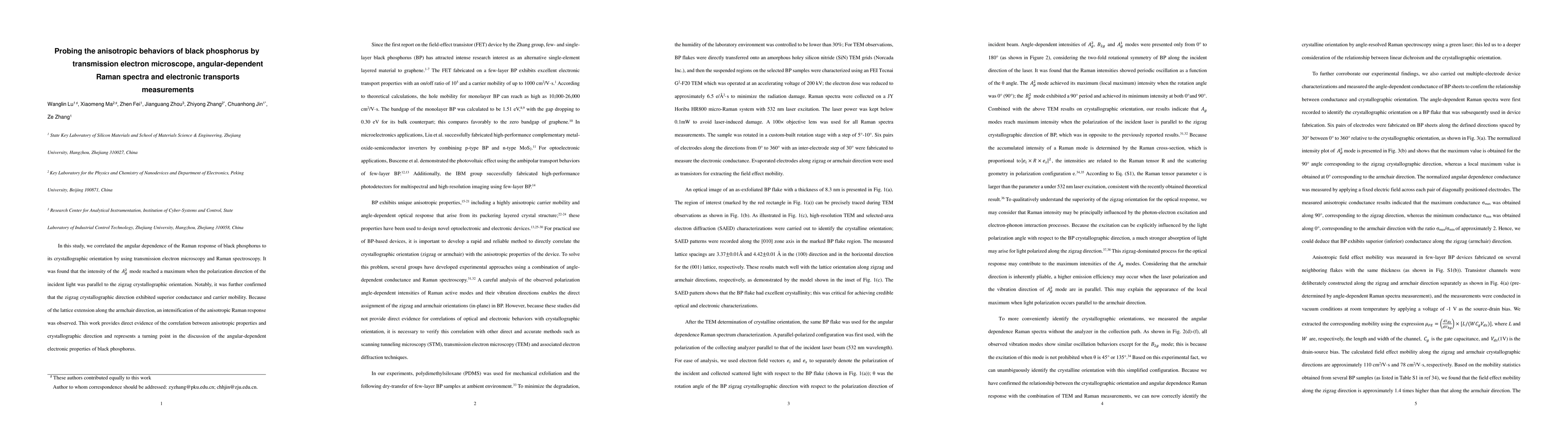 This paper investigates the anisotropic behaviors of black phosphorus using transmission electron microscopy, angular-dependent Raman spectroscopy, and electronic transport measurements. It finds that the zigzag crystallographic orientation exhibits superior conductance and carrier mobility, correlating the anisotropic Raman response with crystallographic direction.