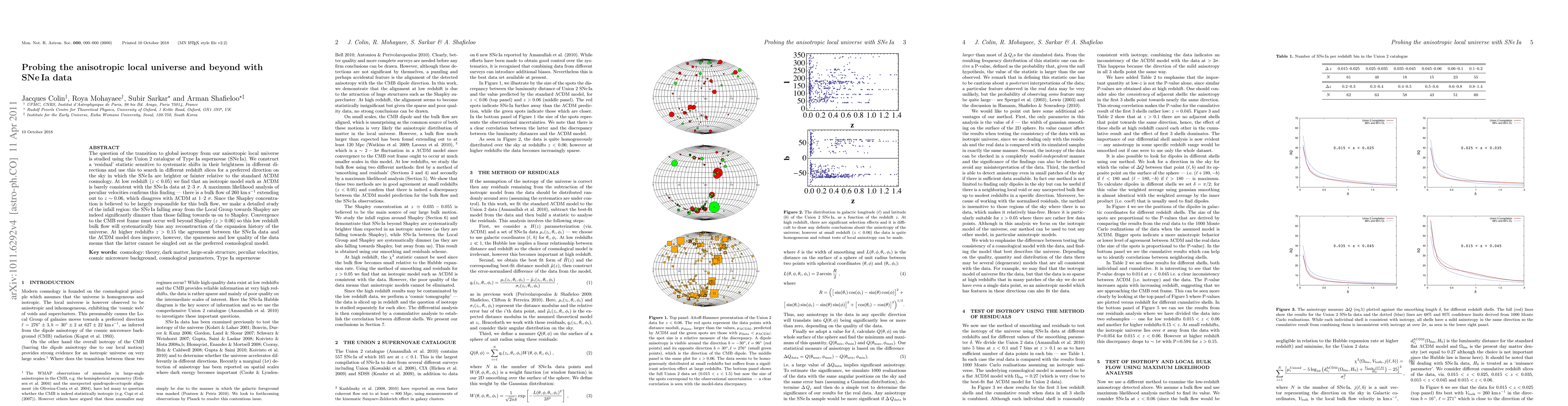 This study uses Type Ia supernova (SNe Ia) data from the Union 2 catalogue to investigate potential anisotropy in the local universe. Findings suggest a low-redshift bulk flow, disagreeing with the LCDM model at 1-2 sigma, and evidence of SNe Ia dimmer when falling away from the Local Group towards Shapley. High-redshift data (z>0.15) show improved agreement with LCDM, though it can't be definitively chosen as the best model due to data sparseness and quality.