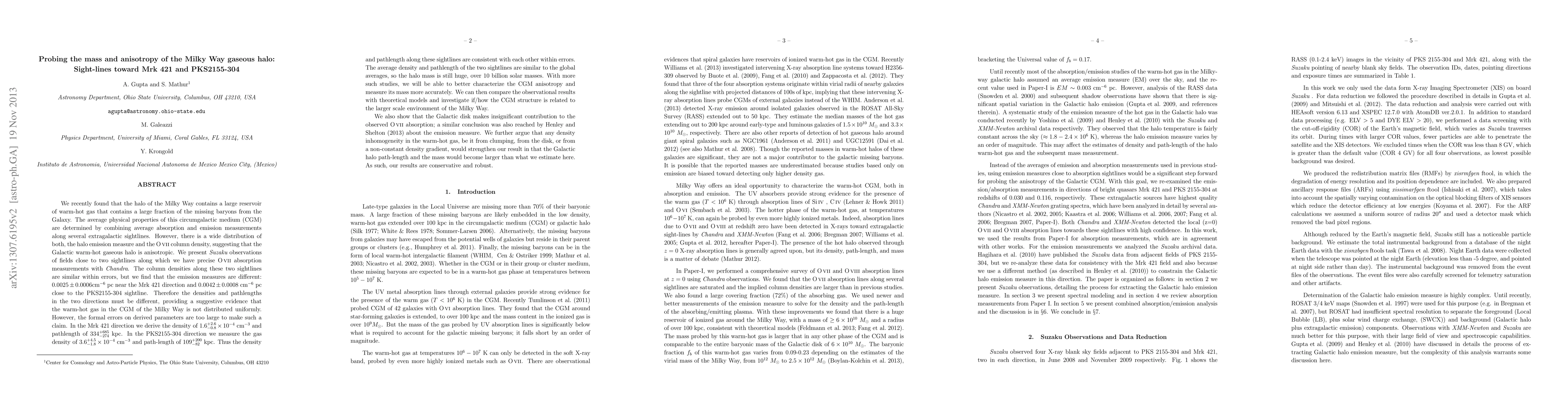 This study uses {\it Suzaku} observations to investigate the anisotropy of the Milky Way's warm-hot gaseous halo along two extragalactic sightlines, finding differing emission measures despite similar absorption column densities. This suggests non-uniform distribution of the circumgalactic medium, though formal errors are large, and the halo mass remains substantial at over 10 billion solar masses.