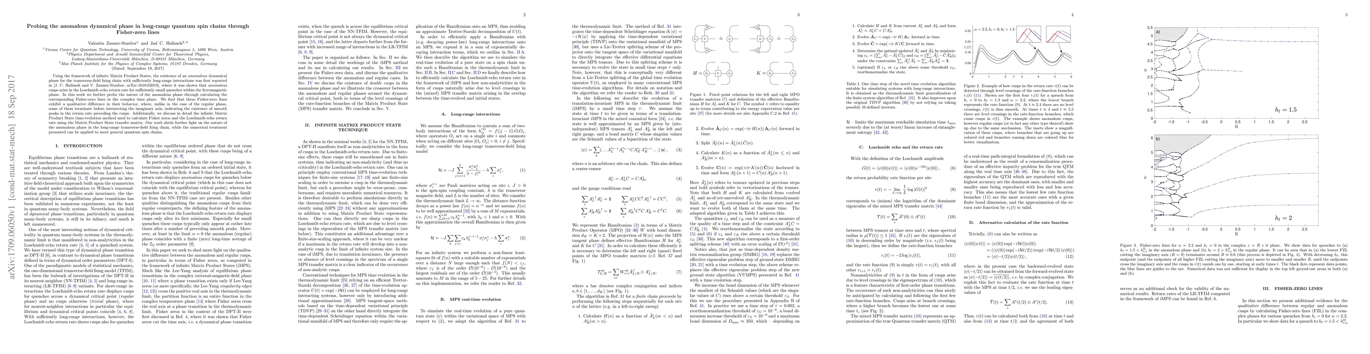 Using the framework of infinite Matrix Product States, the existence of an \textit{anomalous} dynamical phase for the transverse-field Ising chain with sufficiently long-range interactions was first reported in [J.~C.~Halimeh and V.~Zauner-Stauber, arXiv:1610:02019], where it was shown that \textit{anomalous} cusps arise in the Loschmidt-echo return rate for sufficiently small quenches within the ferromagnetic phase. In this work we further probe the nature of the anomalous phase through calculating the corresponding Fisher-zero lines in the complex time plane. We find that these Fisher-zero lines exhibit a qualitative difference in their behavior, where, unlike in the case of the regular phase, some of them terminate before intersecting the imaginary axis, indicating the existence of smooth peaks in the return rate preceding the cusps. Additionally, we discuss in detail the infinite Matrix Product State time-evolution method used to calculate Fisher zeros and the Loschmidt-echo return rate using the Matrix Product State transfer matrix. Our work sheds further light on the nature of the anomalous phase in the long-range transverse-field Ising chain, while the numerical treatment presented can be applied to more general quantum spin chains.