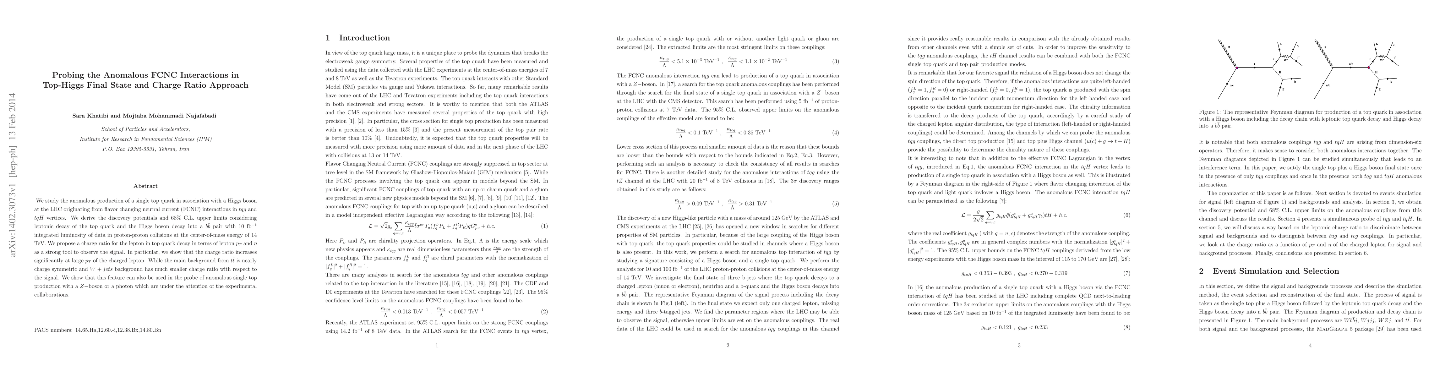 We study the anomalous production of a single top quark in association with a Higgs boson at the LHC originating from flavor changing neutral current (FCNC) interactions in $tqg$ and $tqH$ vertices. We derive the discovery potentials and $68\%$ C.L. upper limits considering leptonic decay of the top quark and the Higgs boson decay into a $b\bar{b}$ pair with 10 fb$^{-1}$ integrated luminosity of data in proton-proton collisions at the center-of-mass energy of 14 TeV. We propose a charge ratio for the lepton in top quark decay in terms of lepton $p_{T}$ and $\eta$ as a strong tool to observe the signal. In particular, we show that the charge ratio increases significantly at large $p_{T}$ of the charged lepton. While the main background from $t\bar{t}$ is nearly charge symmetric and $W+jets$ background has much smaller charge ratio with respect to the signal. We show that this feature can also be used in the probe of anomalous single top production with a $Z-$boson or a photon which are under the attention of the experimental collaborations.