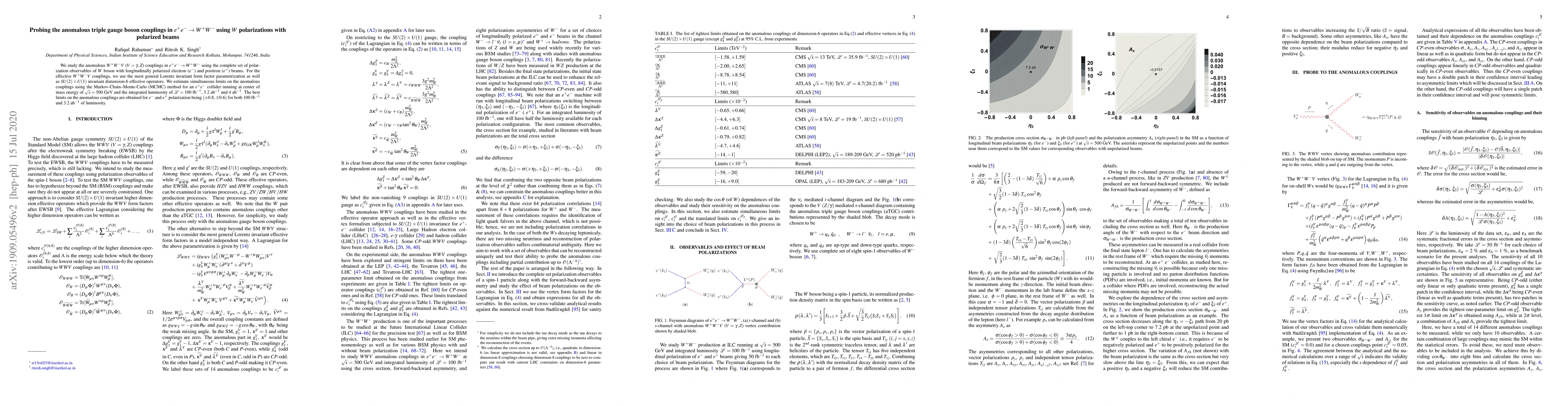 We study the anomalous $W^+W^-V$ ($V=\gamma,Z$) couplings in $e^+e^-\to W^+W^-$ using the complete set of polarization observables of $W$ boson with longitudinally polarized electron ($e^-$) and positron ($e^+$) beams. For the effective $W^+W^-V$ couplings, we use the most general Lorentz invariant form factor parametrization as well as $SU(2)\times U(1)$ invariant dimension-$6$ effective operators. We estimate simultaneous limits on the anomalous couplings using the Markov-Chain--Monte-Carlo (MCMC) method for an $e^+e^-$ collider running at center of mass energy of $\sqrt{s}=500$ GeV and the integrated luminosity of ${\cal L}=100$ fb$^{-1}$, $3.2$ ab$^{-1}$ and $4$ ab$^{-1}$. The best limits on the anomalous couplings are obtained for $e^-$ and $e^+$ polarization being $(\pm 0.8,\mp 0.6)$ for both $100$ fb$^{-1}$ and $3.2$ ab$^{-1}$ of luminosity.
