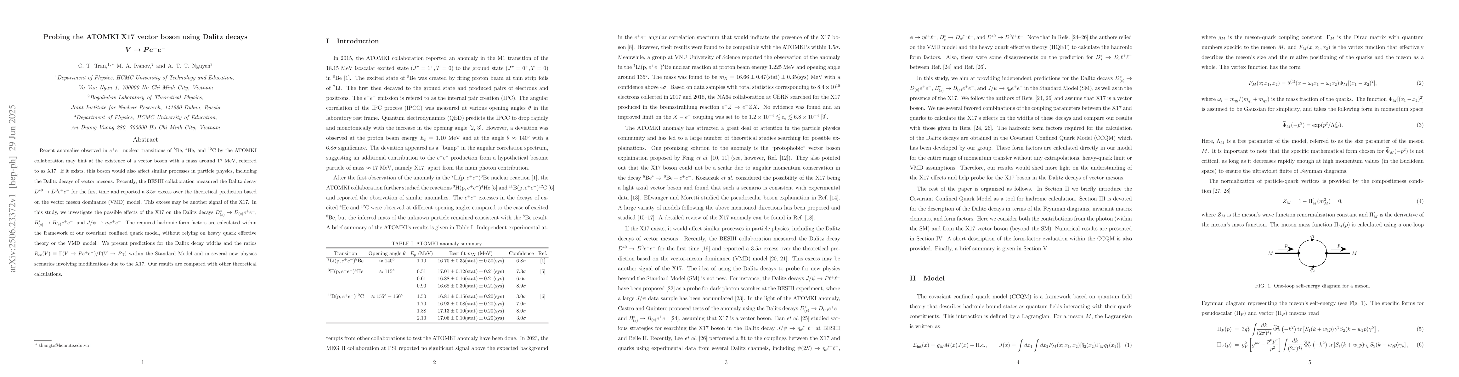 This study investigates potential effects of the hypothetical 17 MeV vector boson (X17) on Dalitz decays of various vector mesons (D*_(s), B*_(s), J/ψ) using a covariant confined quark model. Predictions for decay widths and ratios R_ee(V) are presented for both Standard Model and new physics scenarios involving X17 modifications, comparing results with other theoretical calculations.