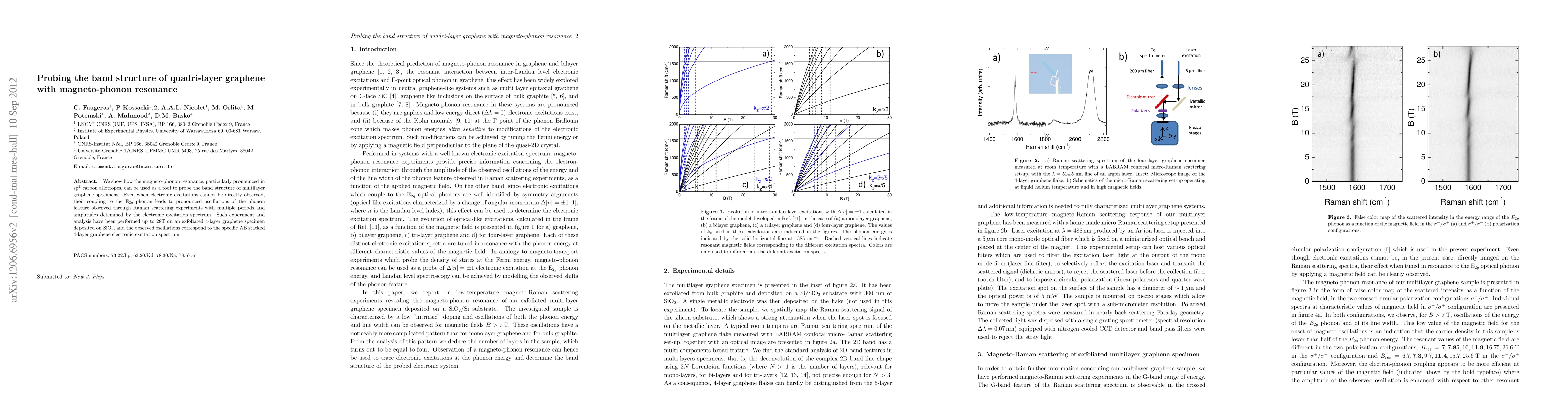 This study utilizes magneto-phonon resonance to investigate the band structure of quadri-layer graphene, revealing electronic excitations via Raman scattering oscillations linked to E2g phonons. Experiments conducted up to 28T on exfoliated 4-layer graphene confirm the method's effectiveness in mapping the electronic excitation spectrum of AB stacked multilayer graphene.