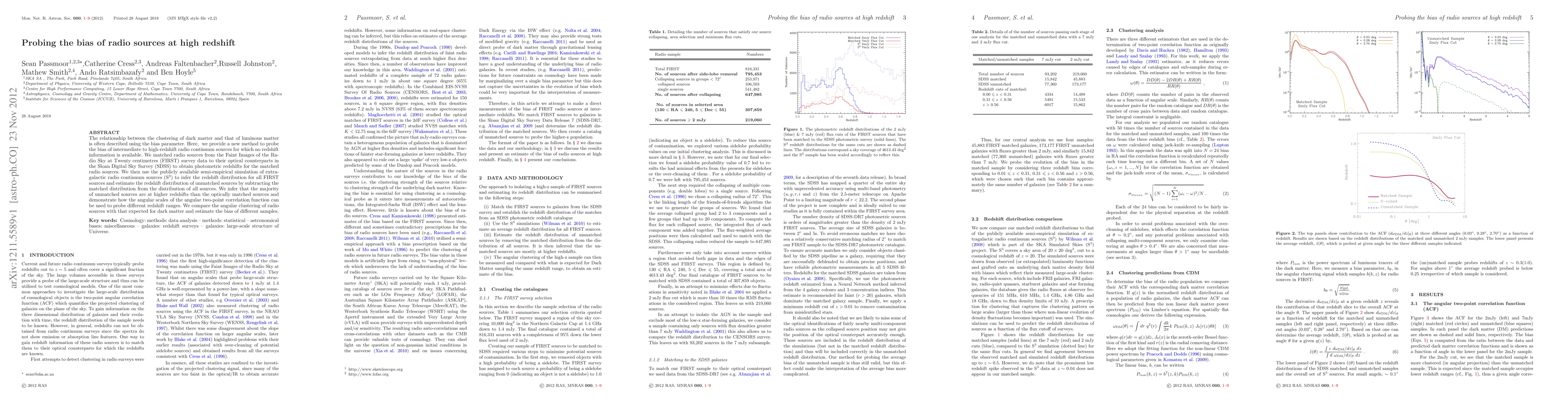 The relationship between the clustering of dark matter and that of luminous matter is often described using the bias parameter. Here, we provide a new method to probe the bias of intermediate to high-redshift radio continuum sources for which no redshift information is available. We matched radio sources from the Faint Images of the Radio Sky at Twenty centimetres (FIRST) survey data to their optical counterparts in the Sloan Digital Sky Survey (SDSS) to obtain photometric redshifts for the matched radio sources. We then use the publicly available semi-empirical simulation of extragalactic radio continuum sources (S3) to infer the redshift distribution for all FIRST sources and estimate the redshift distribution of unmatched sources by subtracting the matched distribution from the distribution of all sources. We infer that the majority of unmatched sources are at higher redshifts than the optically matched sources and demonstrate how the angular scales of the angular two-point correlation function can be used to probe different redshift ranges. We compare the angular clustering of radio sources with that expected for dark matter and estimate the bias of different samples.