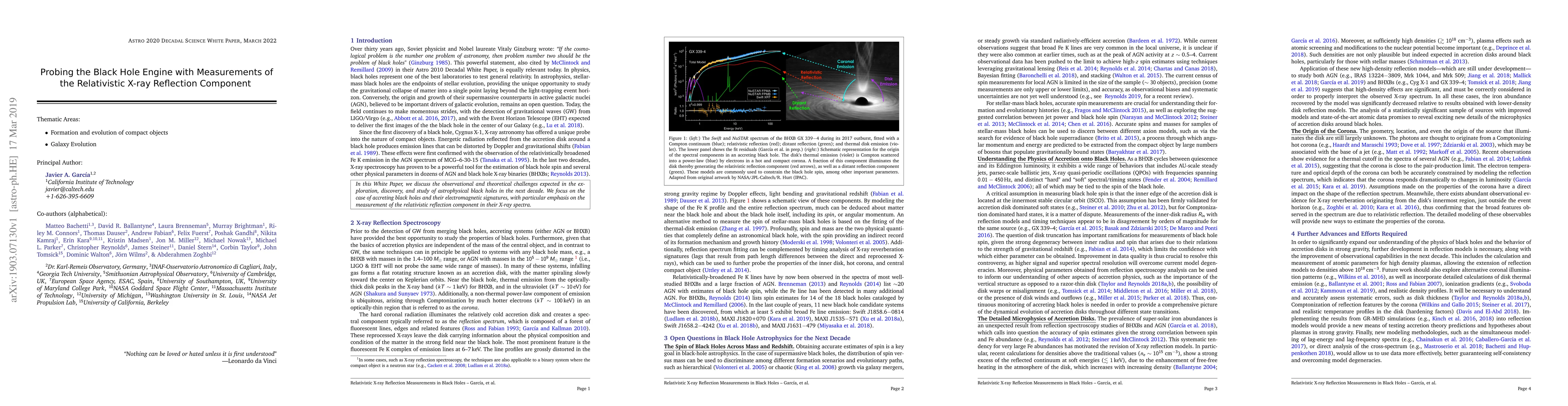 Over the last decades X-ray spectroscopy has proven to be a powerful tool for the estimation of black hole spin and several other key parameters in dozens of AGN and black hole X-ray binaries. In this White Paper, we discuss the observational and theoretical challenges expected in the exploration, discovery, and study of astrophysical black holes in the next decade. We focus on the case of accreting black holes and their electromagnetic signatures, with particular emphasis on the measurement of the relativistic reflection component in their X-ray spectra.