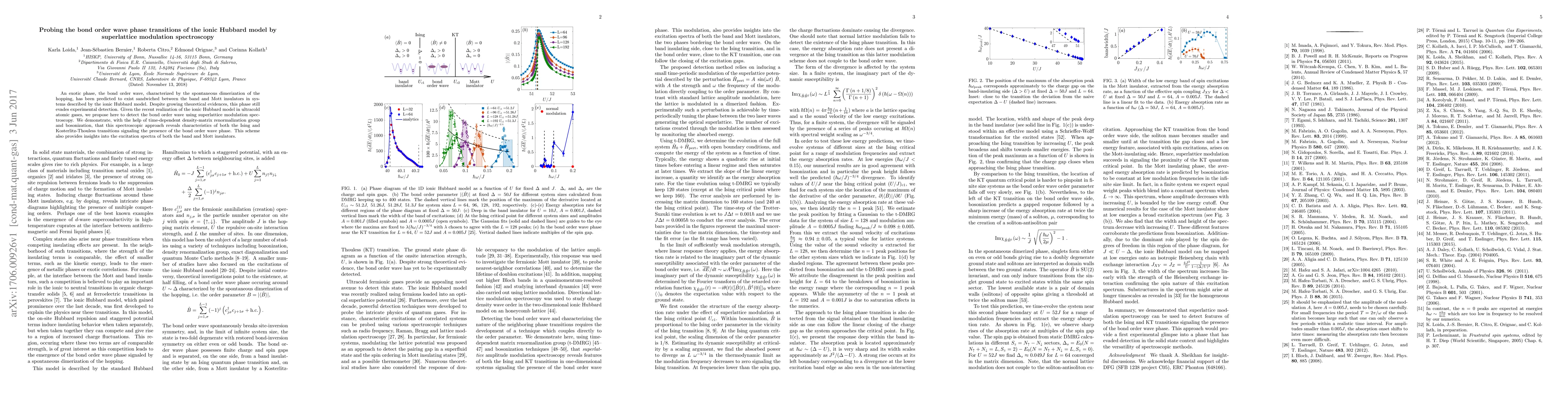 An exotic phase, the bond order wave, characterized by the spontaneous dimerization of the hopping, has been predicted to exist sandwiched between the band and Mott insulators in systems described by the ionic Hubbard model. Despite growing theoretical evidences, this phase still evades experimental detection. Given the recent realization of the ionic Hubbard model in ultracold atomic gases, we propose here to detect the bond order wave using superlattice modulation spectroscopy. We demonstrate, with the help of time-dependent density-matrix renormalization group and bosonization, that this spectroscopic approach reveals characteristics of both the Ising and Kosterlitz-Thouless transitions signaling the presence of the bond order wave phase. This scheme also provides insights into the excitation spectra of both the band and Mott insulators.