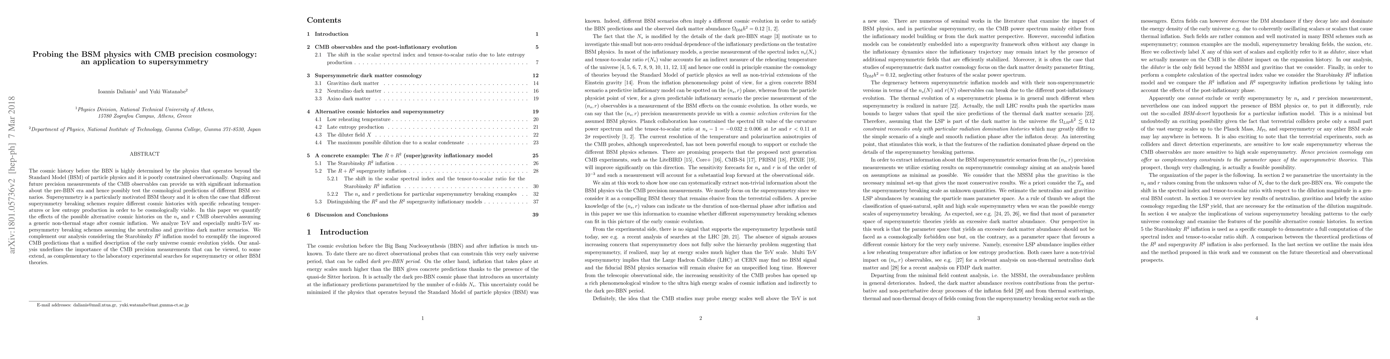 This paper investigates how precision measurements of cosmic microwave background (CMB) observables can reveal insights into the physics beyond the Standard Model, particularly supersymmetry. It examines the impact of different supersymmetry breaking schemes on CMB parameters $n_s$ and $r$, and highlights the importance of CMB data in complementing laboratory searches for BSM theories.