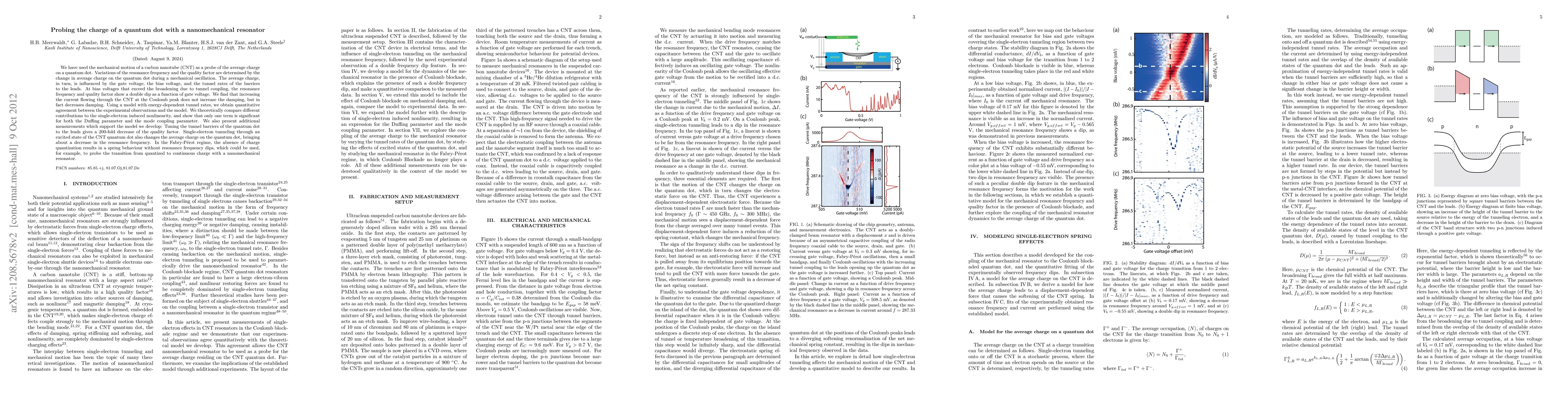 We have used the mechanical motion of a carbon nanotube (CNT) as a probe of the average charge on a quantum dot. Variations of the resonance frequency and the quality factor are determined by the change in average charge on the quantum dot during a mechanical oscillation. The average charge, in turn, is influenced by the gate voltage, the bias voltage, and the tunnel rates of the barriers to the leads. At bias voltages that exceed the broadening due to tunnel coupling, the resonance frequency and quality factor show a double dip as a function of gate voltage. We find that increasing the current flowing through the CNT at the Coulomb peak does not increase the damping, but in fact decreases damping. Using a model with energy-dependent tunnel rates, we obtain quantitative agreement between the experimental observations and the model. We theoretically compare different contributions to the single-electron induced nonlinearity, and show that only one term is significant for both the Duffing parameter and the mode coupling parameter. We also present additional measurements which support the model we develop: Tuning the tunnel barriers of the quantum dot to the leads gives a 200-fold decrease of the quality factor. Single-electron tunneling through an excited state of the CNT quantum dot also changes the average charge on the quantum dot, bringing about a decrease in the resonance frequency. In the Fabry-P\'{e}rot regime, the absence of charge quantization results in a spring behaviour without resonance frequency dips, which could be used, for example, to probe the transition from quantized to continuous charge with a nanomechanical resonator.