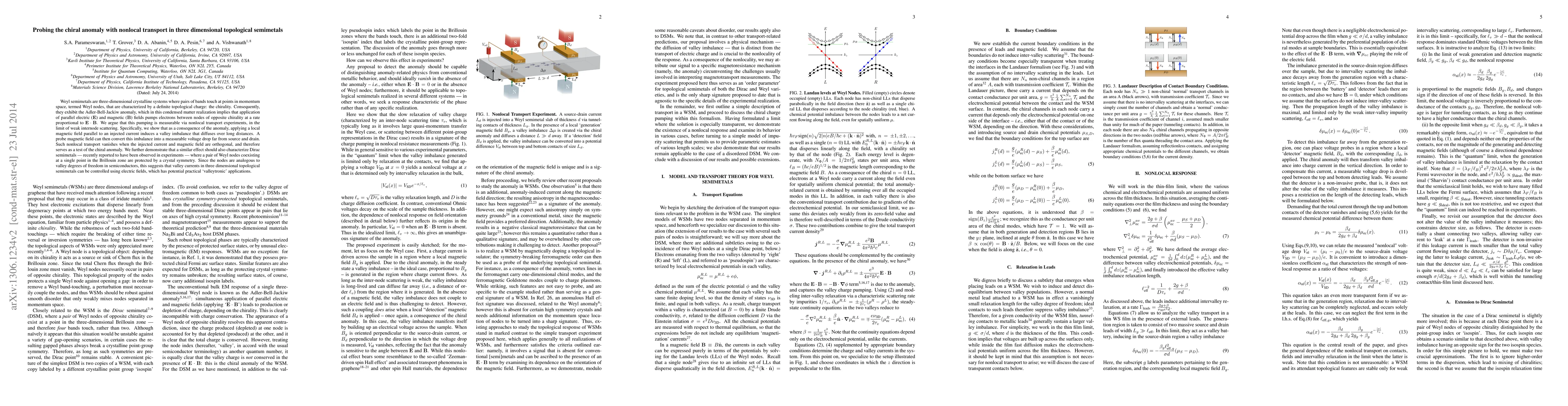 Weyl semimetals are three-dimensional crystalline systems where pairs of bands touch at points in momentum space, termed Weyl nodes, that are characterized by a definite topological charge: the chirality. Consequently, they exhibit the Adler-Bell-Jackiw anomaly, which in this condensed matter realization implies that application of parallel electric ($\mathbf{E}$) and magnetic ($\mathbf{B}$) fields pumps electrons between nodes of opposite chirality at a rate proportional to $\mathbf{E}\cdot\mathbf{B}$. We argue that this pumping is measurable via nonlocal transport experiments, in the limit of weak internode scattering. Specifically, we show that as a consequence of the anomaly, applying a local magnetic field parallel to an injected current induces a valley imbalance that diffuses over long distances. A probe magnetic field can then convert this imbalance into a measurable voltage drop far from source and drain. Such nonlocal transport vanishes when the injected current and magnetic field are orthogonal, and therefore serves as a test of the chiral anomaly. We further demonstrate that a similar effect should also characterize Dirac semimetals --- recently reported to have been observed in experiments --- where a pair of Weyl nodes coexisting at a single point in the Brillouin zone are protected by a crystal symmetry. Since the nodes are analogous to valley degrees of freedom in semiconductors, this suggests that valley currents in three dimensional topological semimetals can be controlled using electric fields, which has potential practical `valleytronic' applications.