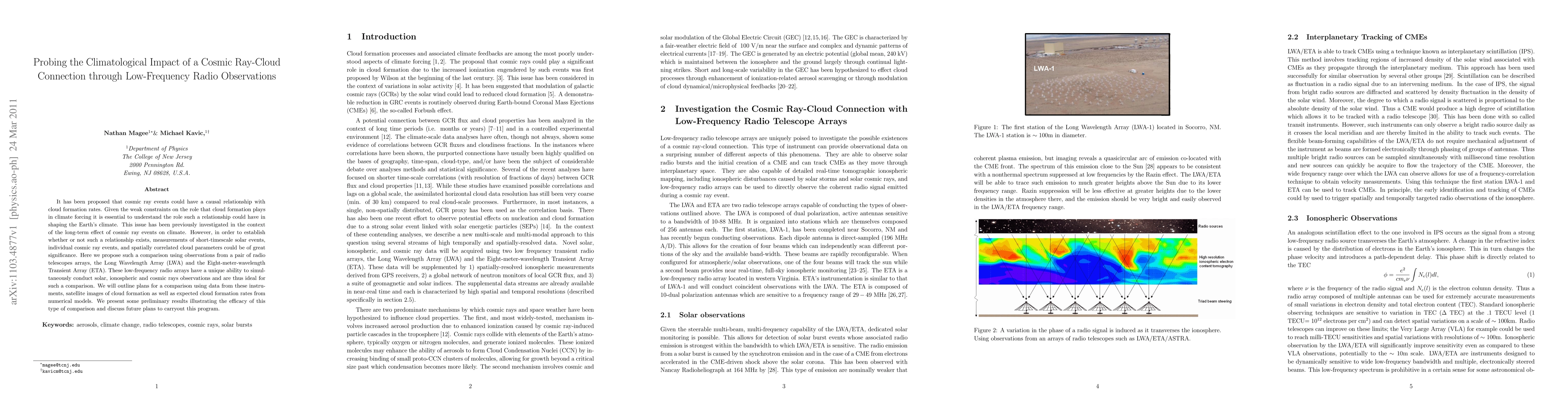 It has been proposed that cosmic ray events could have a causal relationship with cloud formation rates. Given the weak constraints on the role that cloud formation plays in climate forcing it is essential to understand the role such a relationship could have in shaping the Earth's climate. This issue has been previously investigated in the context of the long-term effect of cosmic ray events on climate. However, in order to establish whether or not such a relationship exists, measurements of short-timescale solar events, individual cosmic ray events, and spatially correlated cloud parameters could be of great significance. Here we propose such a comparison using observations from a pair of radio telescopes arrays, the Long Wavelength Array (LWA) and the Eight-meter-wavelength Transient Array (ETA). These low-frequency radio arrays have a unique ability to simultaneously conduct solar, ionospheric and cosmic rays observations and are thus ideal for such a comparison. We will outline plans for a comparison using data from these instruments, satellite images of cloud formation as well as expected cloud formation rates from numerical models. We present some preliminary results illustrating the efficacy of this type of comparison and discuss future plans to carryout this program.