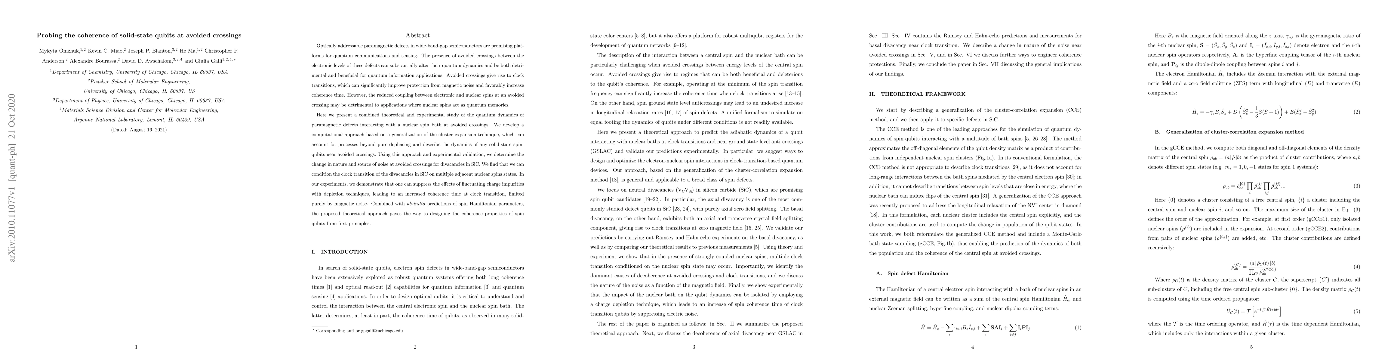 Optically addressable paramagnetic defects in wide-band-gap semiconductors are promising platforms for quantum communications and sensing. The presence of avoided crossings between the electronic levels of these defects can substantially alter their quantum dynamics and be both detrimental and beneficial for quantum information applications. Avoided crossings give rise to clock transitions, which can significantly improve protection from magnetic noise and favorably increase coherence time. However, the reduced coupling between electronic and nuclear spins at an avoided crossing may be detrimental to applications where nuclear spins act as quantum memories. Here we present a combined theoretical and experimental study of the quantum dynamics of paramagnetic defects interacting with a nuclear spin bath at avoided crossings. We develop a computational approach based on a generalization of the cluster expansion technique, which can account for processes beyond pure dephasing and describe the dynamics of any solid-state spin-qubits near avoided crossings. Using this approach and experimental validation, we determine the change in nature and source of noise at avoided crossings for divacancies in SiC. We find that we can condition the clock transition of the divacancies in SiC on multiple adjacent nuclear spins states. In our experiments, we demonstrate that one can suppress the effects of fluctuating charge impurities with depletion techniques, leading to an increased coherence time at clock transition, limited purely by magnetic noise. Combined with ab-initio predictions of spin Hamiltonian parameters, the proposed theoretical approach paves the way to designing the coherence properties of spin qubits from first principles.