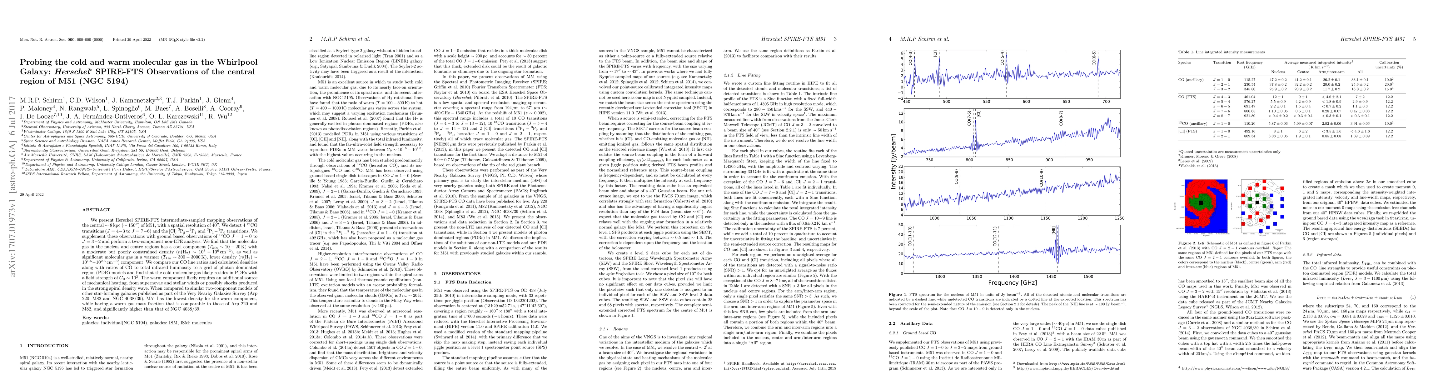 This study uses Herschel SPIRE-FTS observations to analyze the molecular gas in the central region of the Whirlpool Galaxy (M51), revealing both cold and warm gas components with distinct temperatures and densities. The cold gas is found in photon-dominated regions, while the warm gas likely requires additional heating from supernovae and stellar winds.