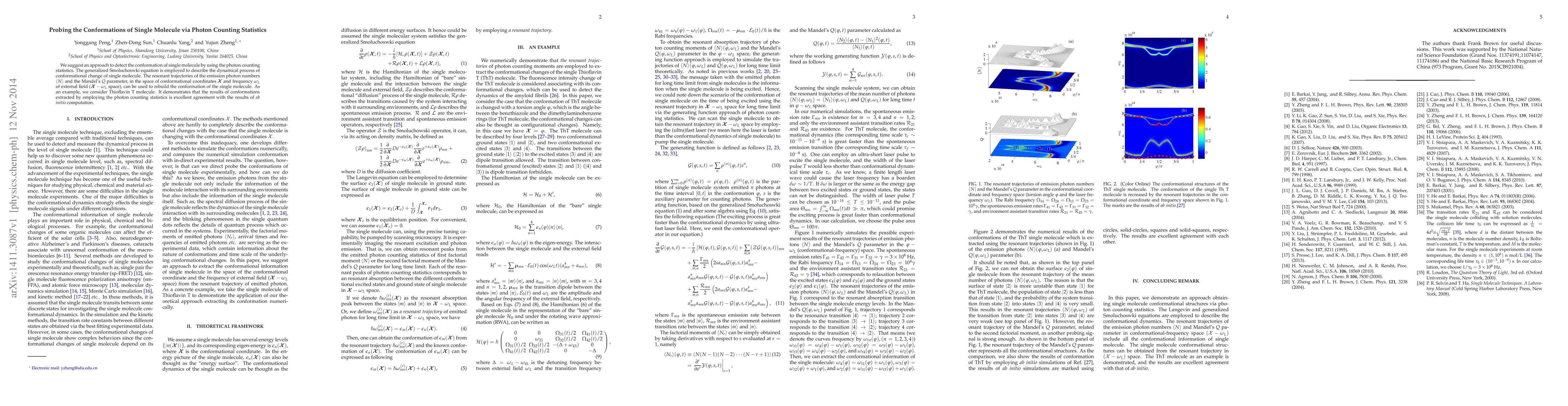 This paper proposes a method to determine the conformation of single molecules using photon counting statistics, utilizing the generalized Smoluchowski equation. The study demonstrates that resonant trajectories of photon numbers and Mandel's $Q$ parameter in the conformational coordinate space can reconstruct the molecule's conformation, validated by agreement with ab initio calculations using Thioflavin T as an example.