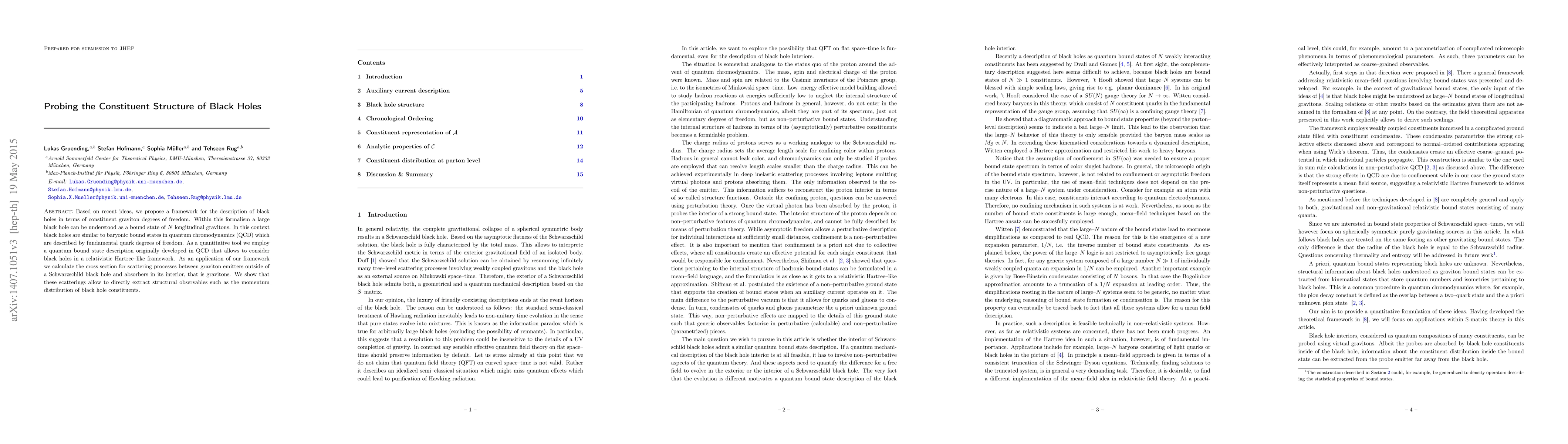 Based on recent ideas, we propose a framework for the description of black holes in terms of constituent graviton degrees of freedom. Within this formalism a large black hole can be understood as a bound state of N longitudinal gravitons. In this context black holes are similar to baryonic bound states in quantum chromodynamics which are described by fundamental quark degrees of freedom. As a quantitative tool we employ a quantum bound state description originally developed in QCD that allows to consider black holes in a relativistic Hartree like framework. As an application of our framework we calculate the cross section for scattering processes between graviton emitters outside of a Schwarzschild black hole and absorbers in its interior, that is gravitons. We show that these scatterings allow to directly extract structural observables such as the momentum distribution of black hole constituents.