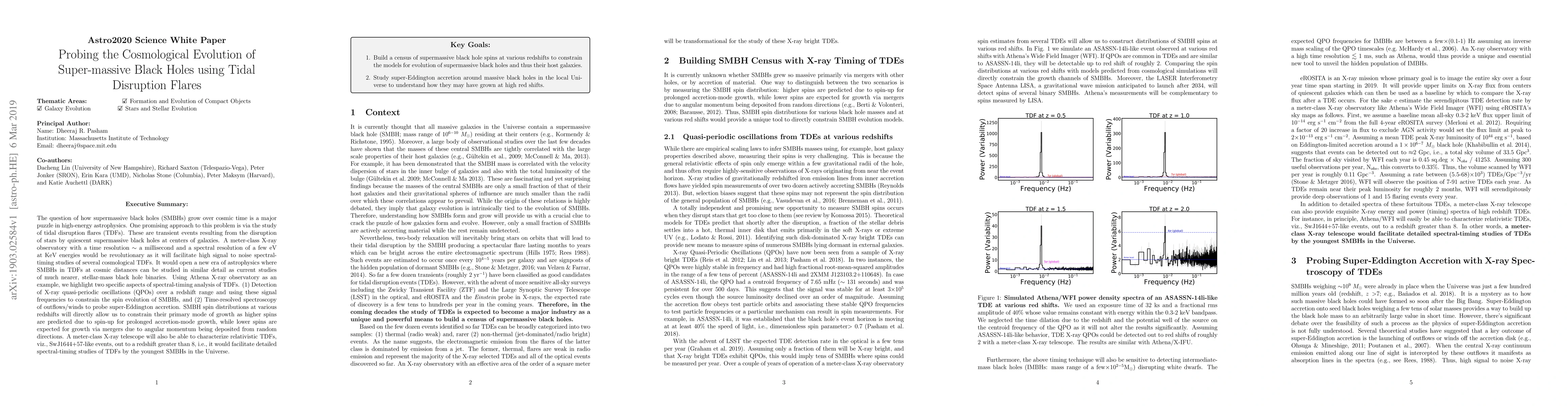 The question of how supermassive black holes (SMBHs) grow over cosmic time is a major puzzle in high-energy astrophysics. One promising approach to this problem is via the study of tidal disruption flares (TDFs). These are transient events resulting from the disruption of stars by quiescent supermassive black holes at centers of galaxies. A meter-class X-ray observatory with a time resolution $\sim$ a millisecond and a spectral resolution of a few eV at KeV energies would be revolutionary as it will facilitate high signal to noise spectral-timing studies of several cosmological TDFs. It would open a new era of astrophysics where SMBHs in TDFs at cosmic distances can be studied in similar detail as current studies of much nearer, stellar-mass black hole binaries. Using Athena X-ray observatory as an example, we highlight two specific aspects of spectral-timing analysis of TDFs. (1) Detection of X-ray quasi-periodic oscillations (QPOs) over a redshift range and using these signal frequencies to constrain the spin evolution of SMBHs, and (2) Time-resolved spectroscopy of outflows/winds to probe super-Eddington accretion. SMBH spin distributions at various redshifts will directly allow us to constrain their primary mode of growth as higher spins are predicted due to spin-up for prolonged accretion-mode growth, while lower spins are expected for growth via mergers due to angular momentum being deposited from random directions. A meter-class X-ray telescope will also be able to characterize relativistic TDFs, viz., SwJ1644+57-like events, out to a redshift greater than 8, i.e., it would facilitate detailed spectral-timing studies of TDFs by the youngest SMBHs in the Universe.